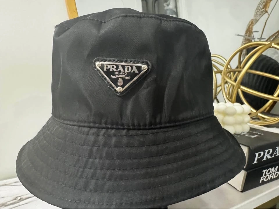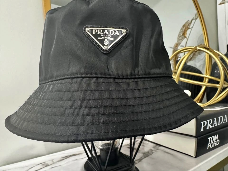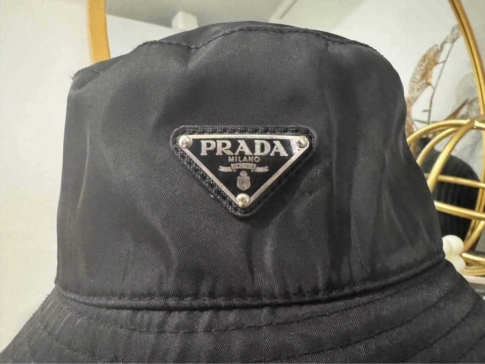 This Prada bucket hat is crafted from sleek black nylon and features the brand's signature triangular logo in a metallic finish. Its minimalist design and downward-sloping brim offer a touch of luxury and elegance, making it a versatile accessory for any occasion.