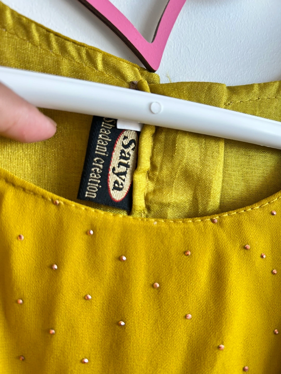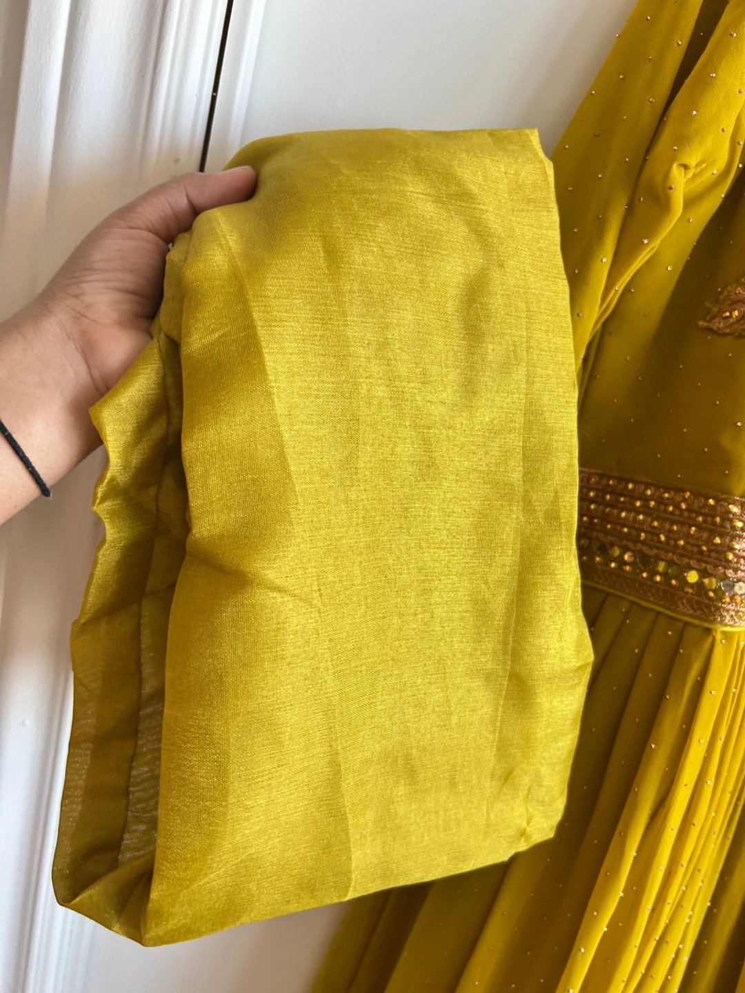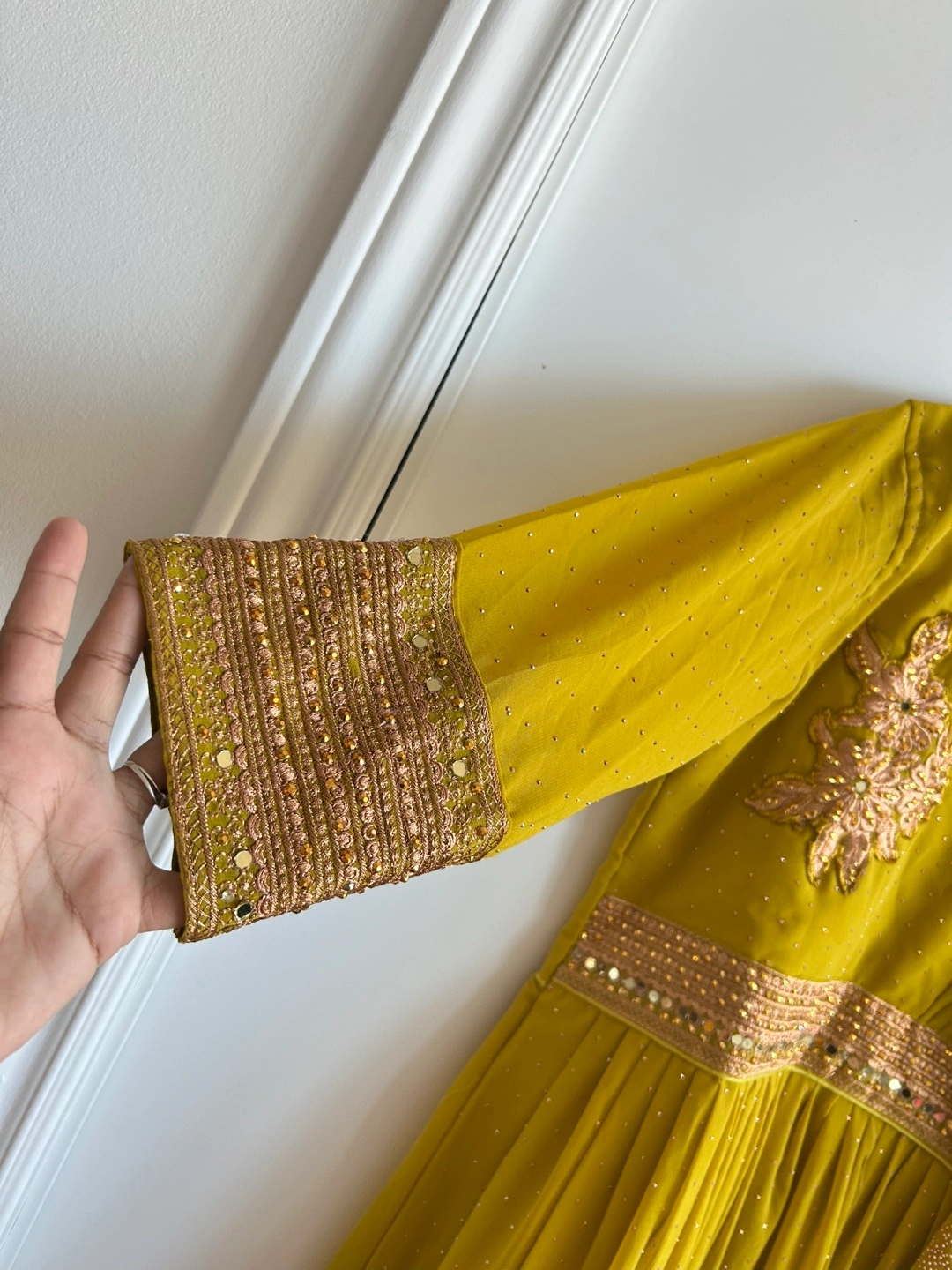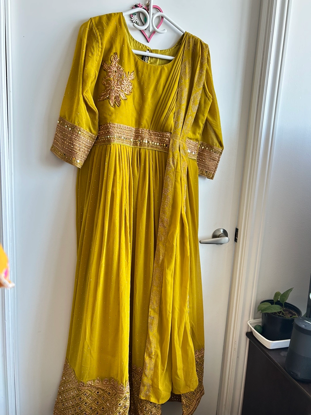 Beautiful mustard yellow Anarkali suit. Intricate gold embroidery and embellishments. Three quarter sleeves. Comes with a matching dupatta attached . Floor length. And pant