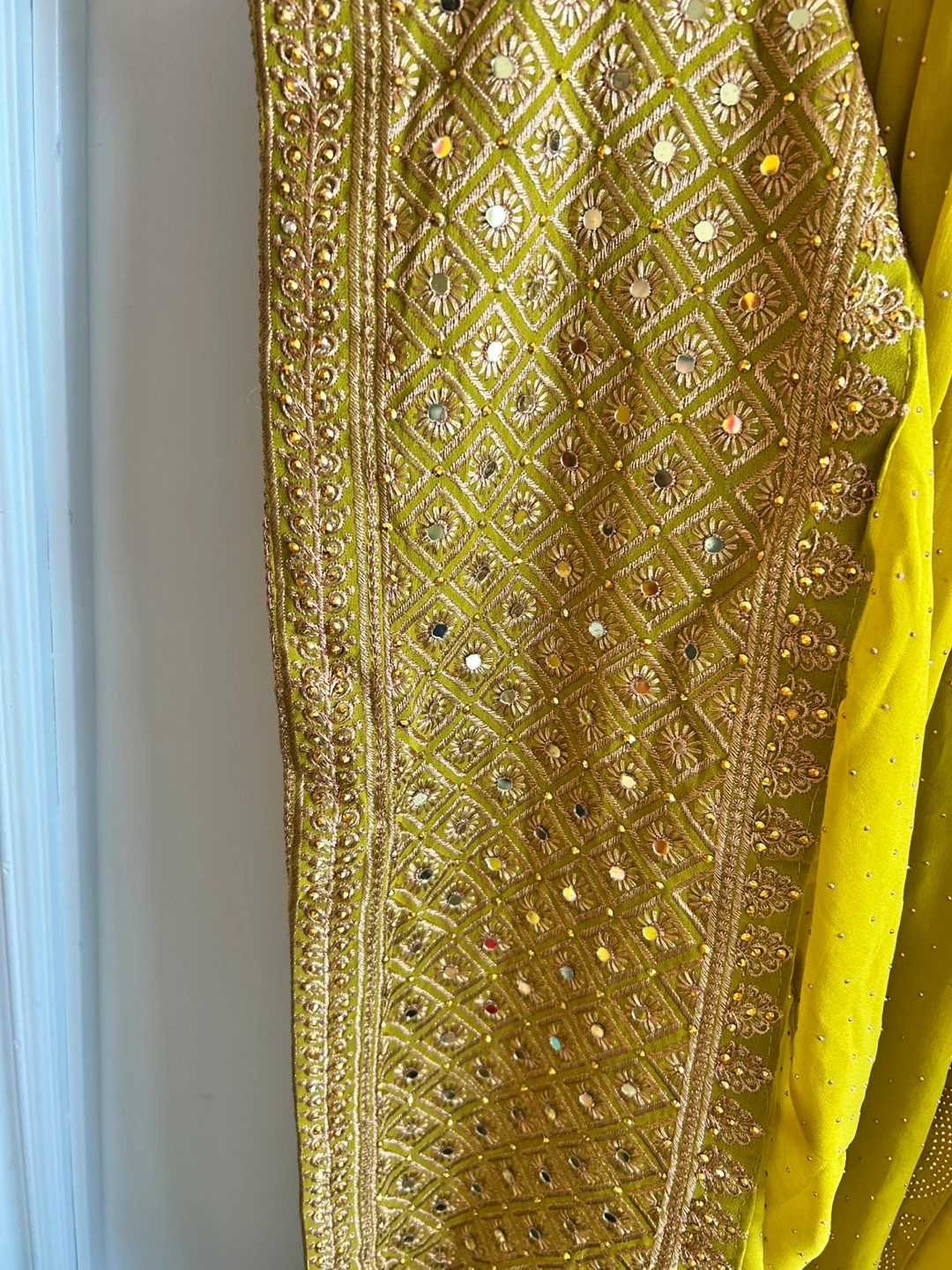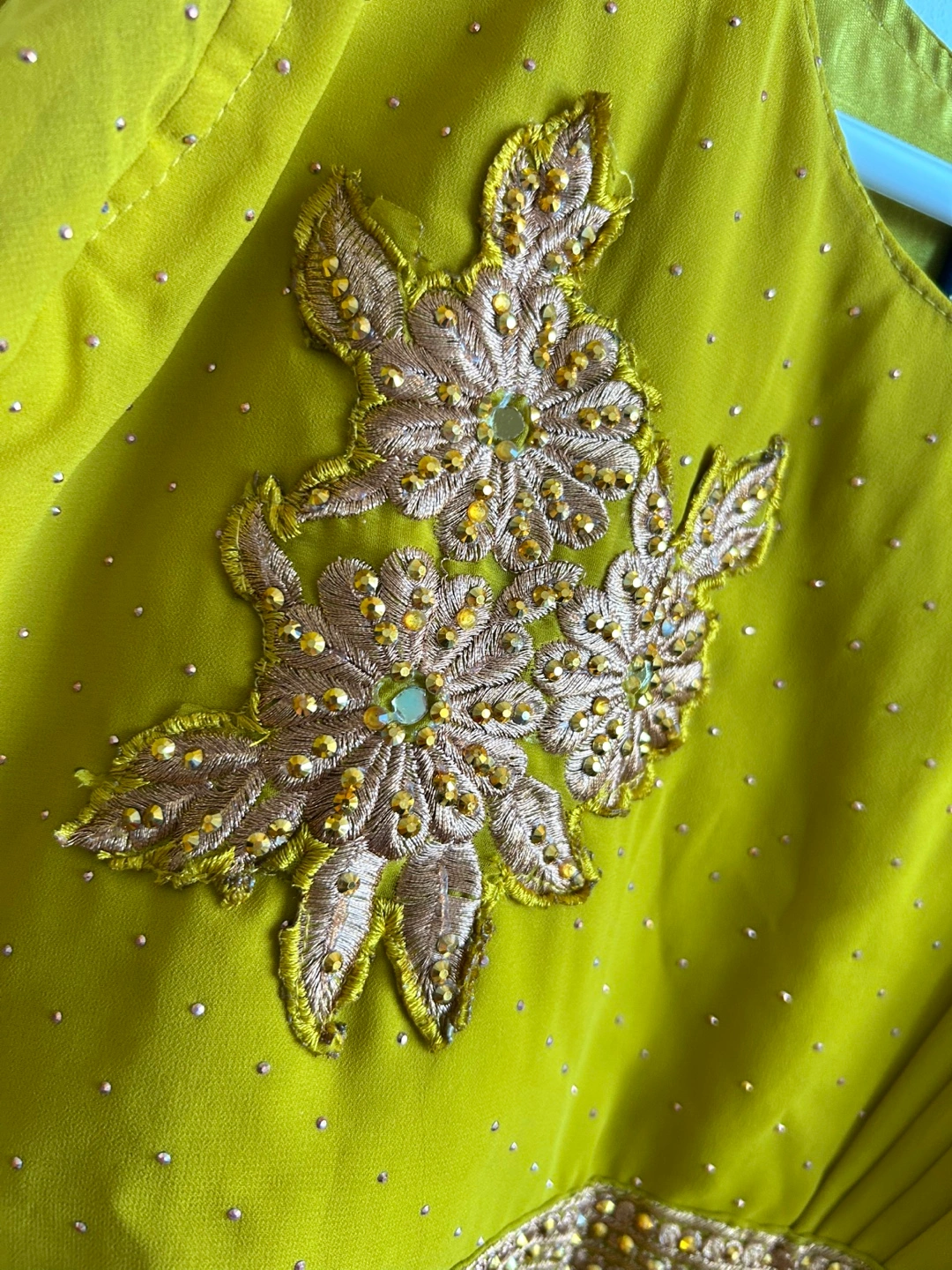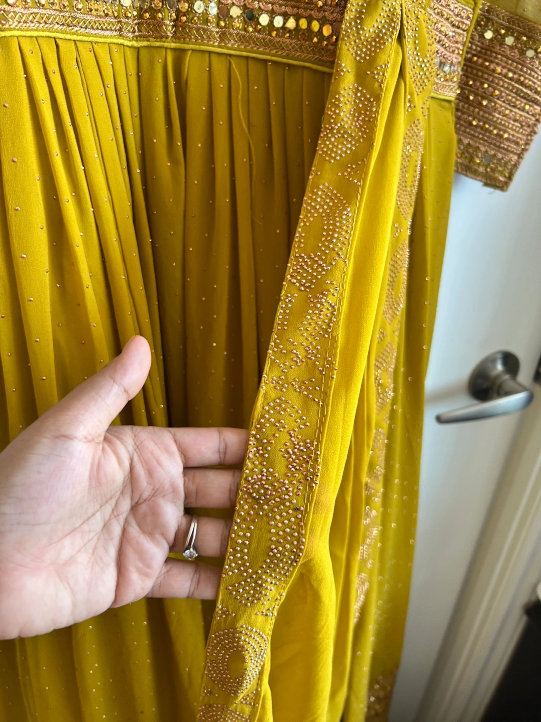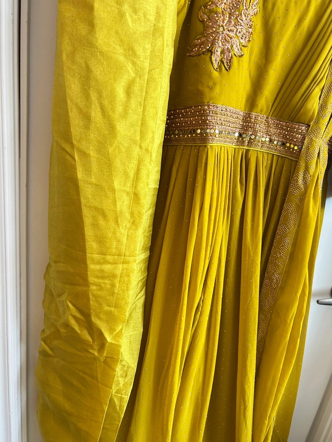 Beautiful mustard yellow Anarkali suit. Intricate gold embroidery and embellishments. Three quarter sleeves. Comes with a matching dupatta attached . Floor length. And pant