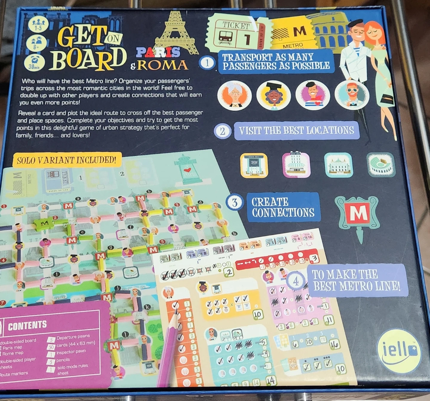 This is the Get On Board: Paris & Roma board game. It's a strategy game where players plan metro routes. Includes a double-sided board and 30 cards.