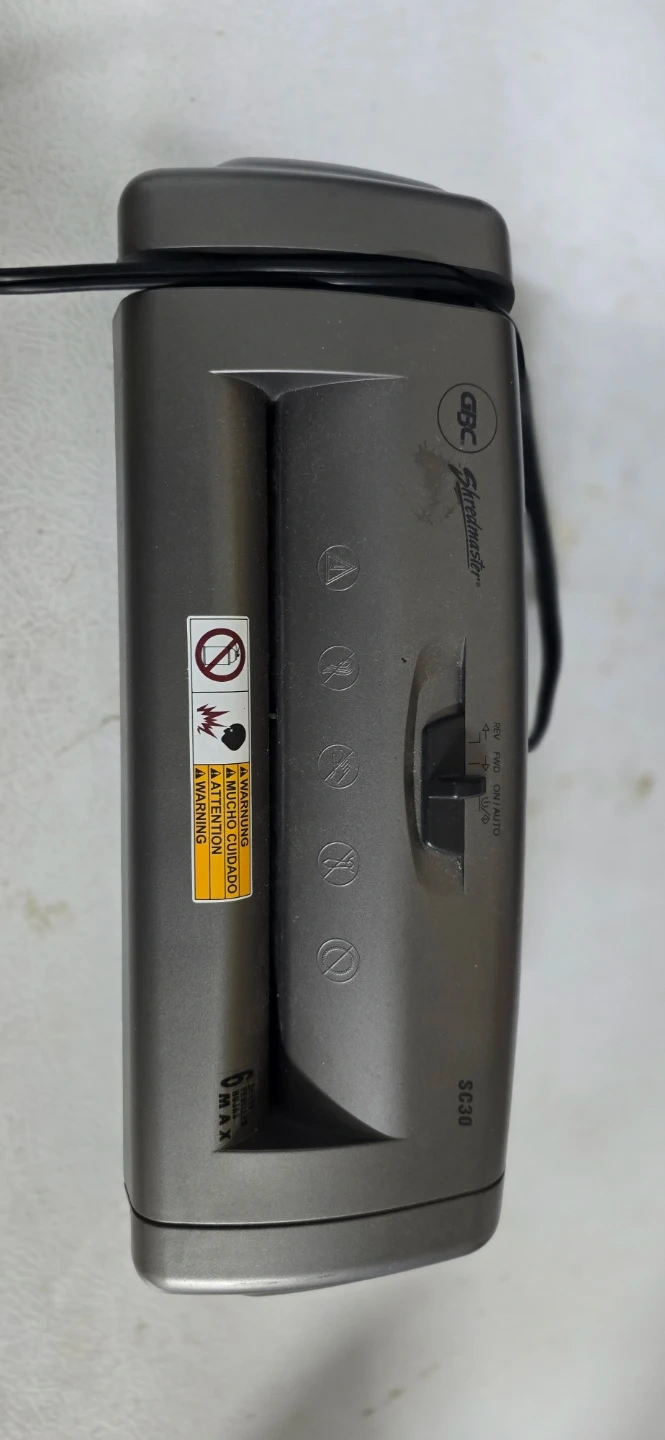 This is a GBC Shredmaster SC30 paper shredder. It has a grey finish and an auto/on/off switch. Perfect for personal use at home or in a small office. Shreds paper quickly and efficiently!