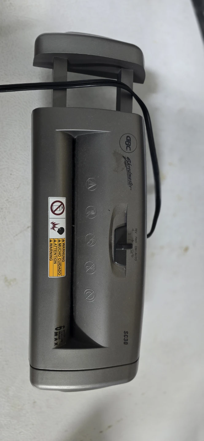 This is a GBC Shredmaster SC30 paper shredder. It has a grey finish and an auto/on/off switch. Perfect for personal use at home or in a small office. Shreds paper quickly and efficiently!