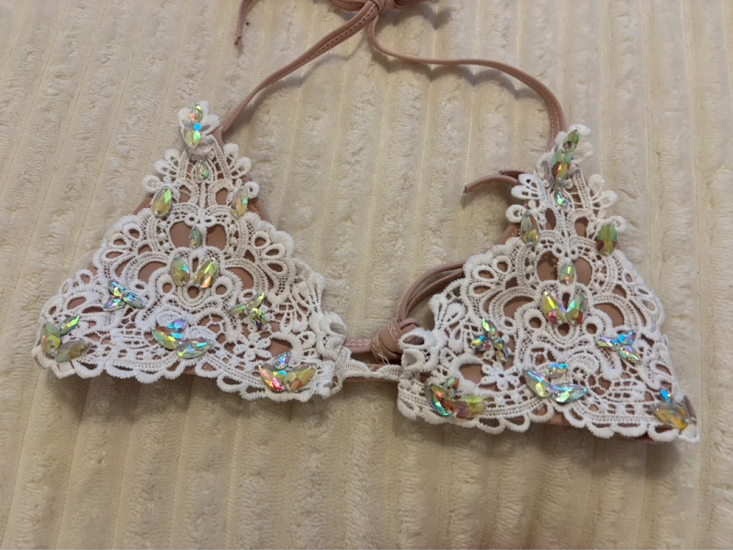 This two-piece bikini features a pink base with white lace overlays adorned with iridescent rhinestones. The top has adjustable straps and a tie closure. The bottoms are a tie-side style, also featuring lace and rhinestone detailing. Size is small.