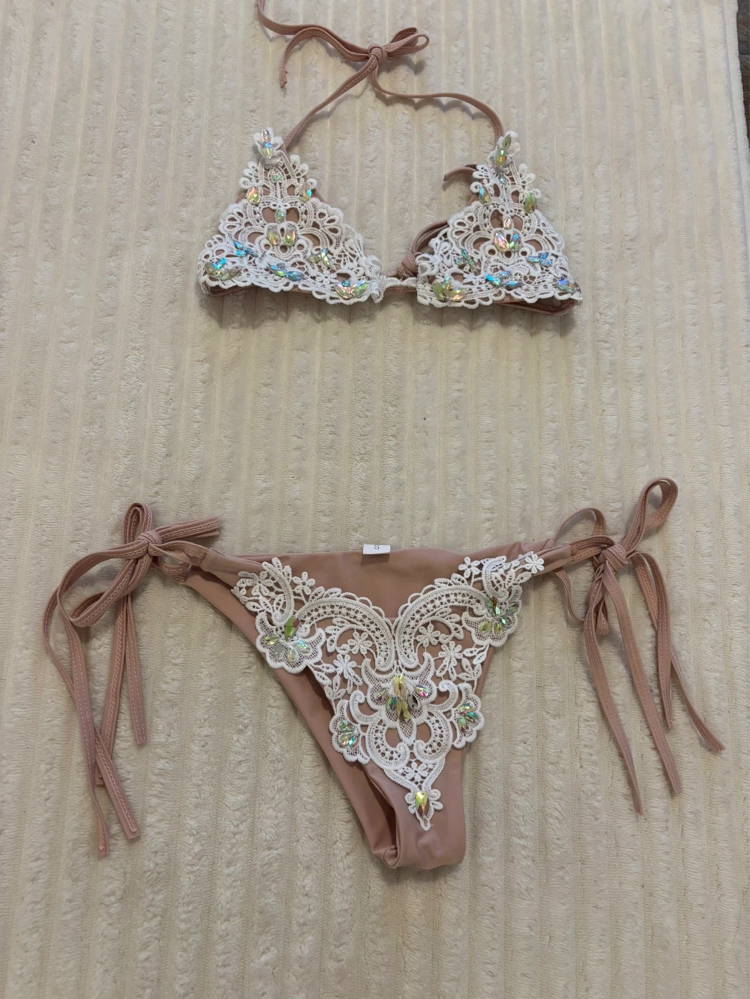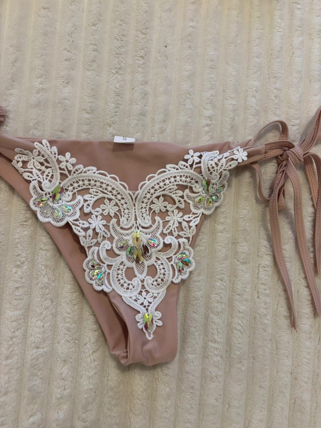 This two-piece bikini features a pink base with white lace overlays adorned with iridescent rhinestones. The top has adjustable straps and a tie closure. The bottoms are a tie-side style, also featuring lace and rhinestone detailing. Size is small.