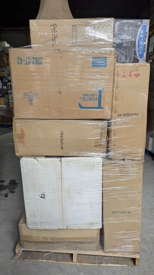 Mixed pallet with furniture and general merchandise at an extreme discount. Large boxed items, furniture pieces, and assorted retail products. Big volume, heavy pallet, strong resale upside.