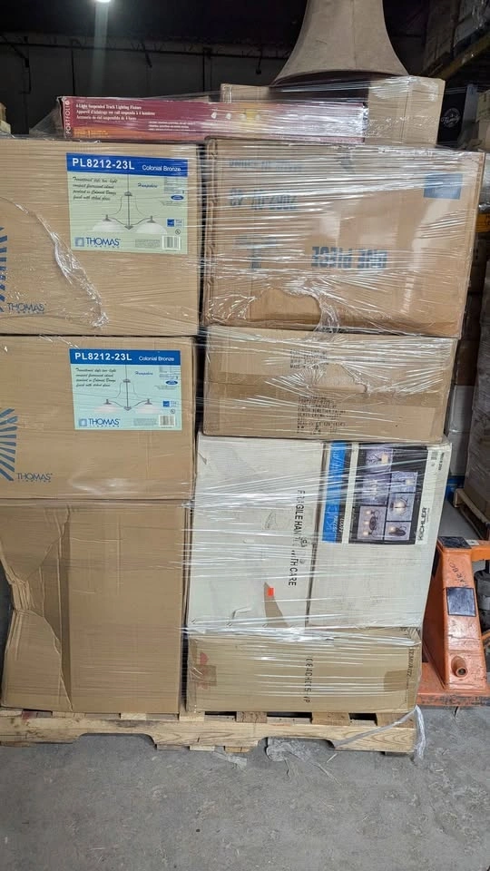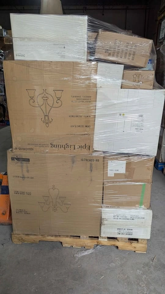 Mixed pallet with furniture and general merchandise at an extreme discount. Large boxed items, furniture pieces, and assorted retail products. Big volume, heavy pallet, strong resale upside.