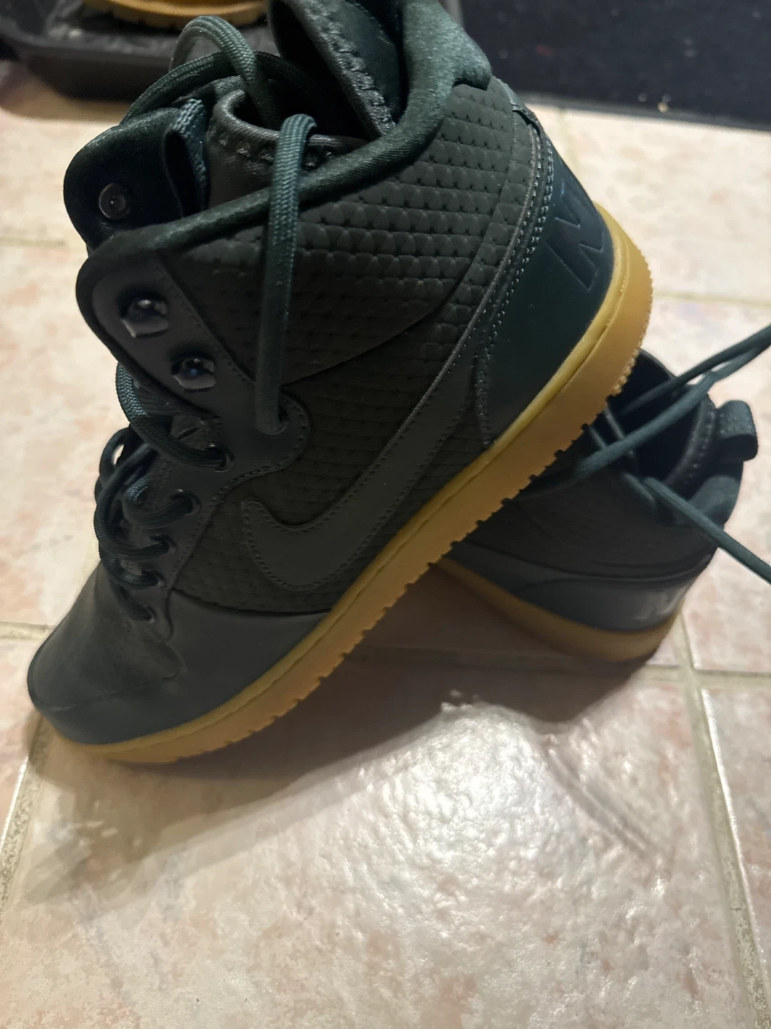 These Nike high-top sneakers are a dark green colour. They feature a textured pattern on the sides and a gum sole. The Nike logo is embossed on the heel.