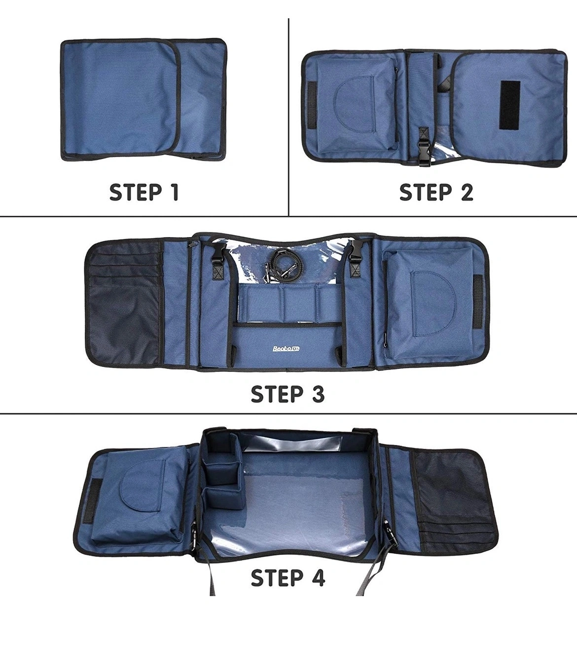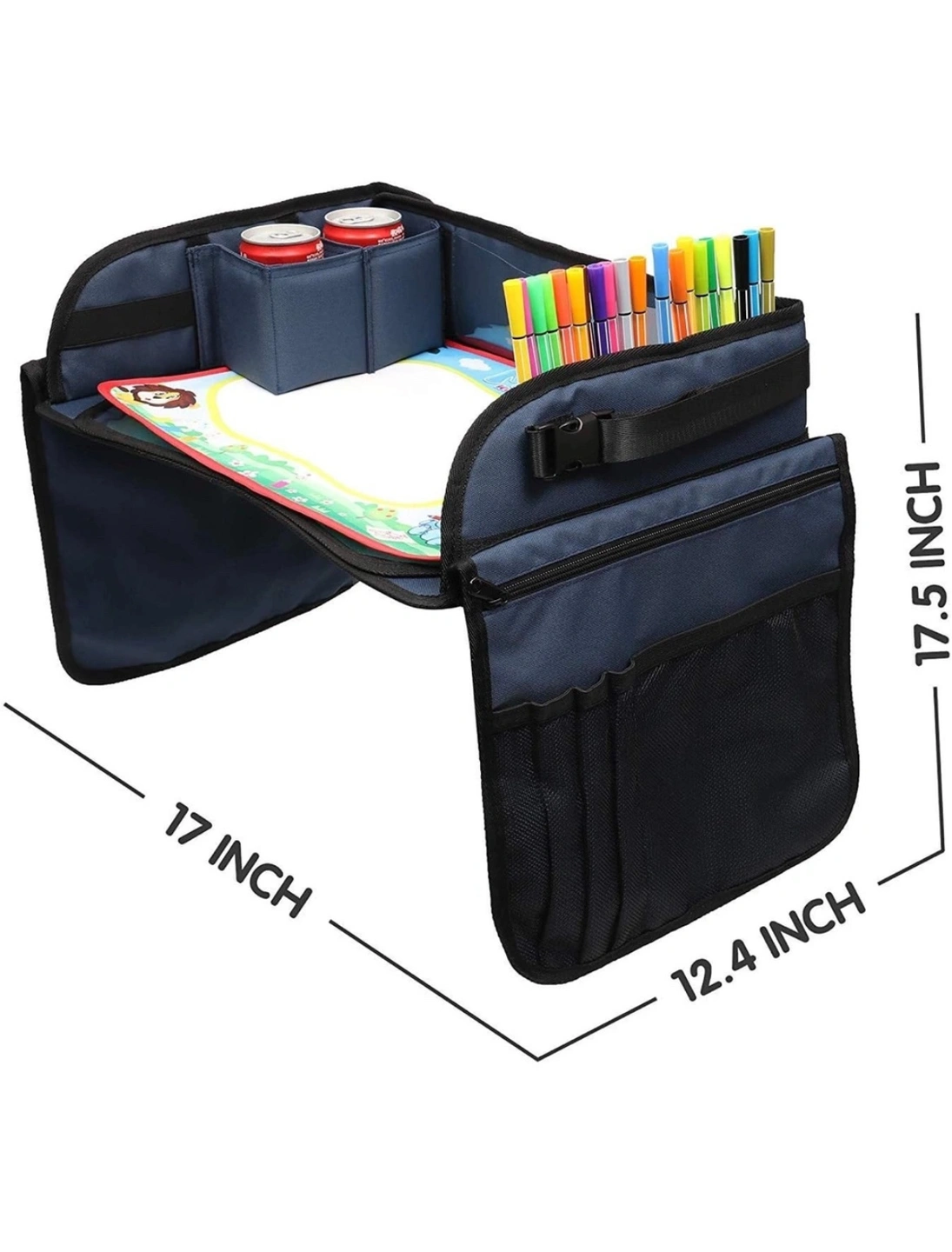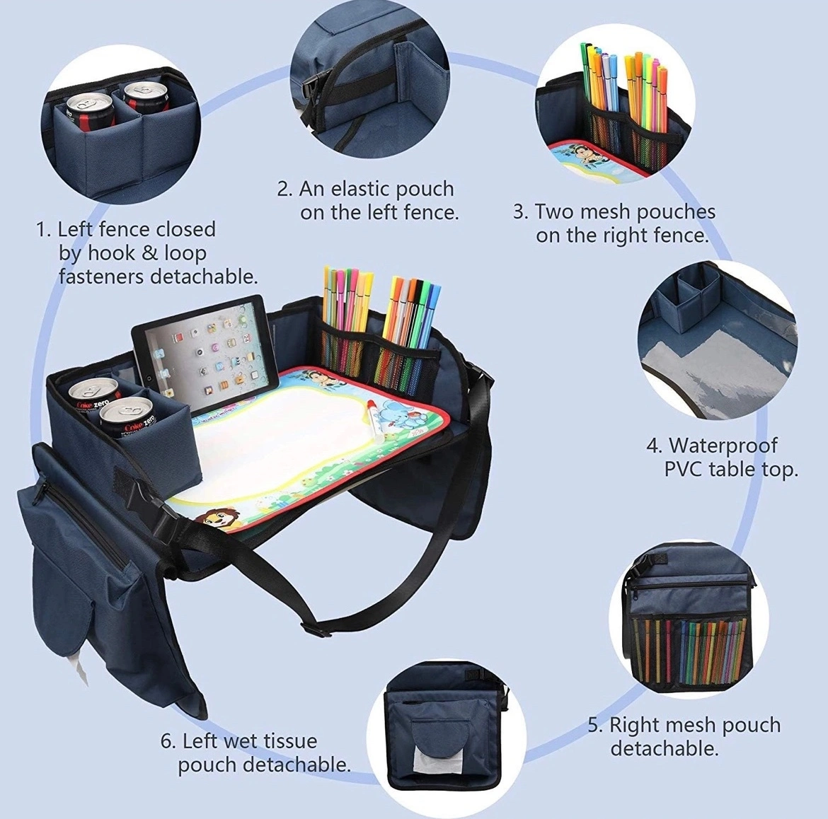 Car seat back organizer with multiple compartments. Features a waterproof PVC table top. Perfect for keeping kids entertained on road trips.