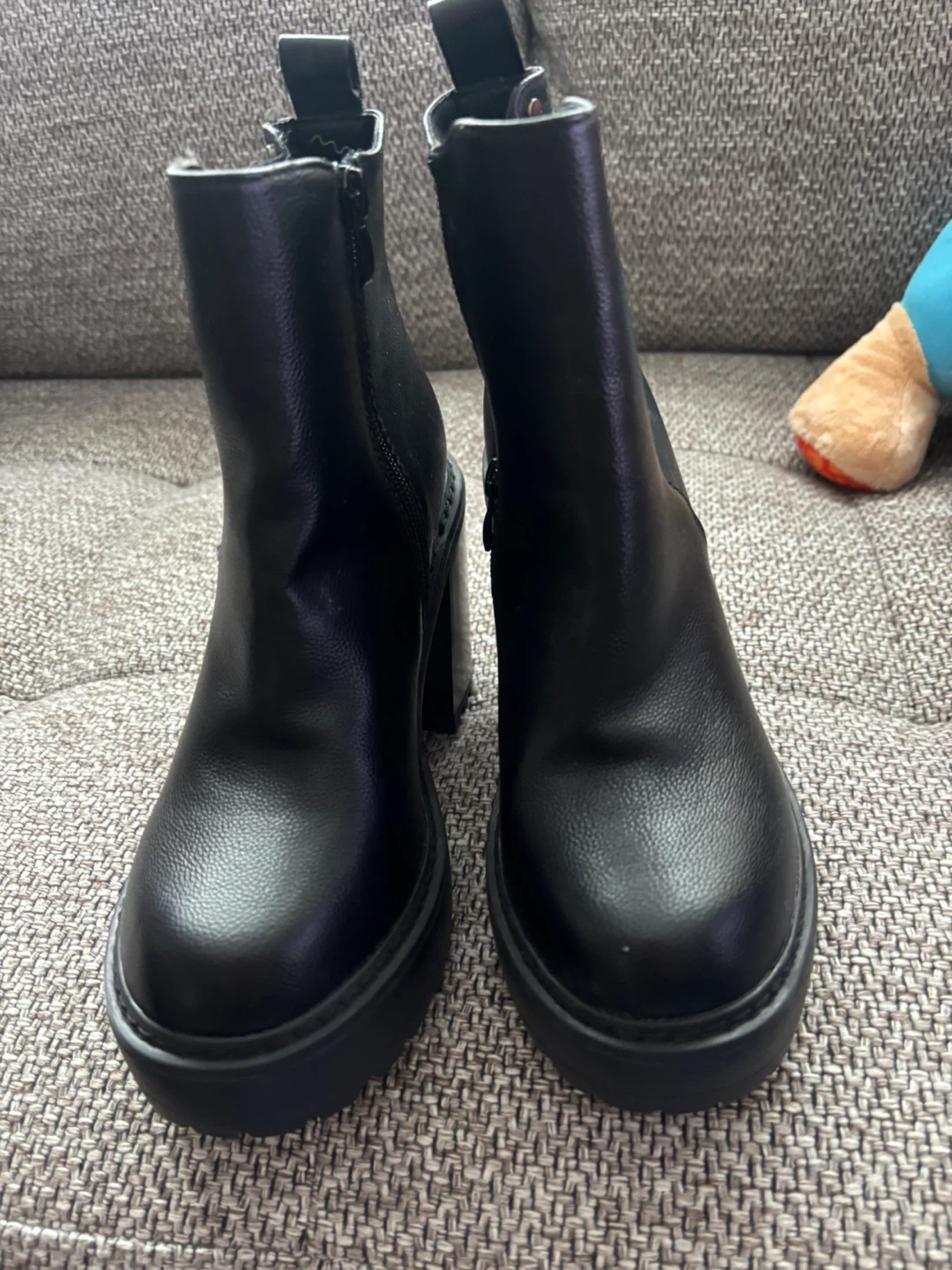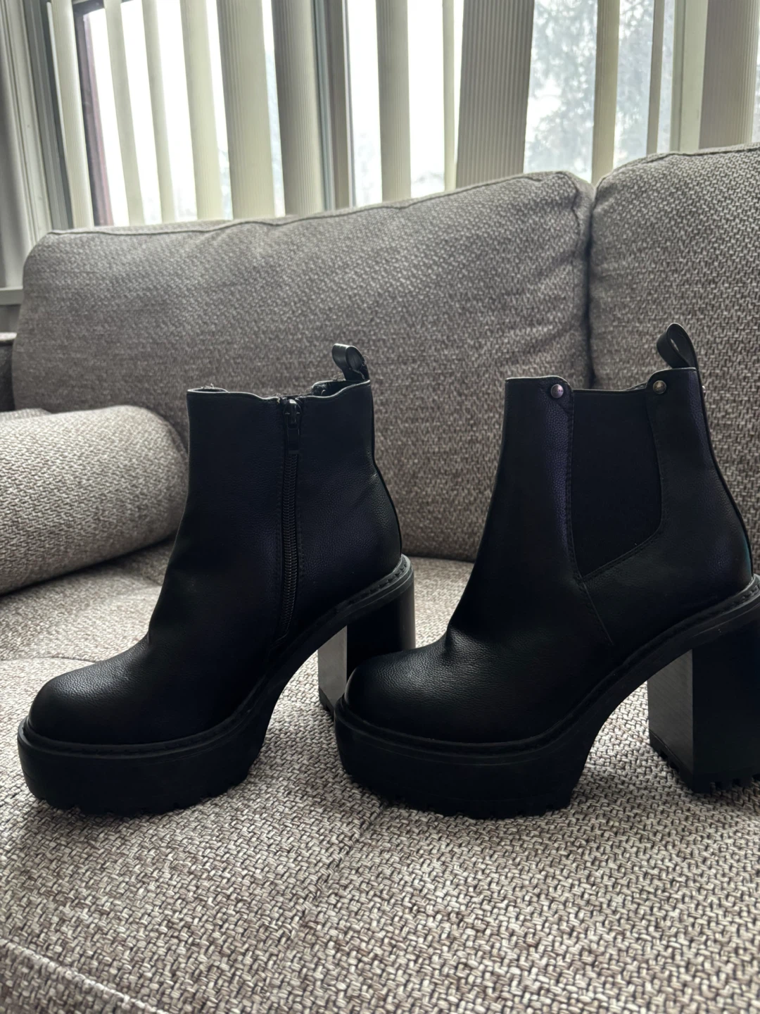 These black ankle boots have a stylish platform and a chunky block heel. They feature a side zipper closure for easy wear.