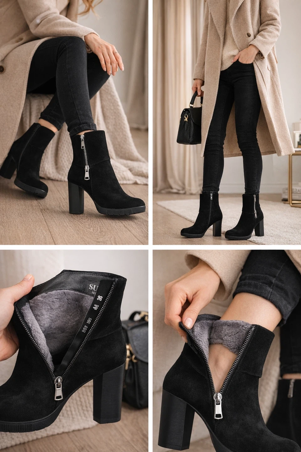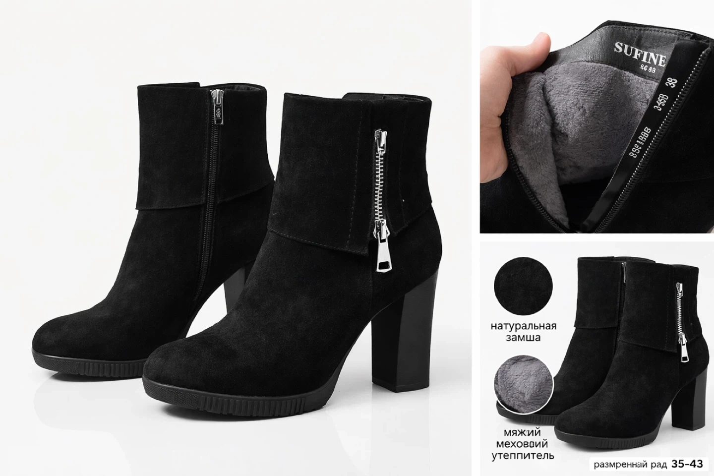 SUFINE Black Suede Winter Ankle Boots - Size 38