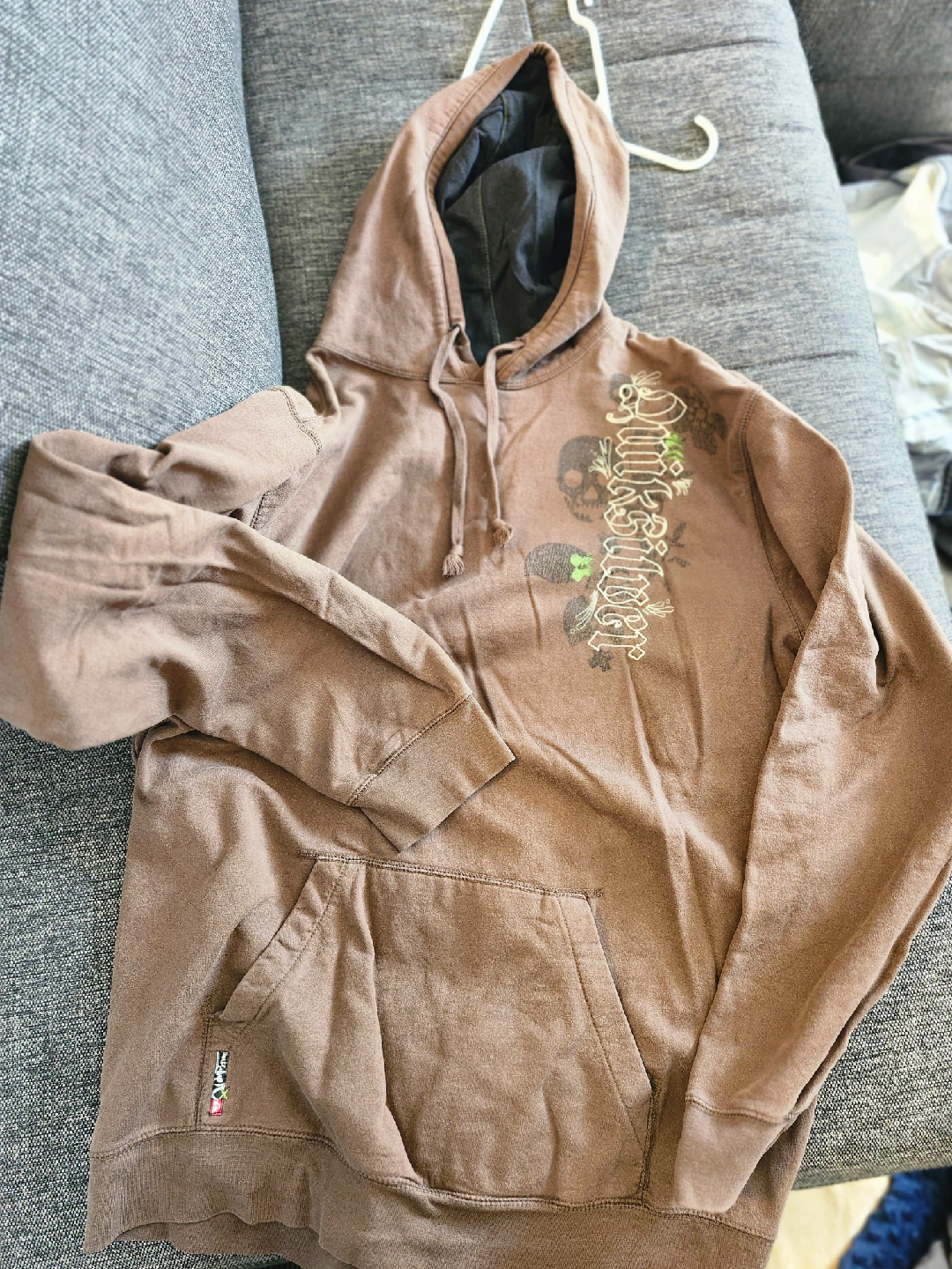 Selling a Quiksilver hoodie in size XXL. It's a brown colour with a cool design on the front. Perfect for staying cozy!