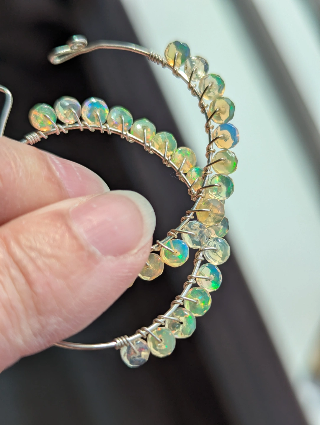 Beautiful handmade sterling silver hoop earrings. Featuring pale yellow-green opals. Lightweight and comfortable to wear. Perfect for everyday wear or a special occasion.