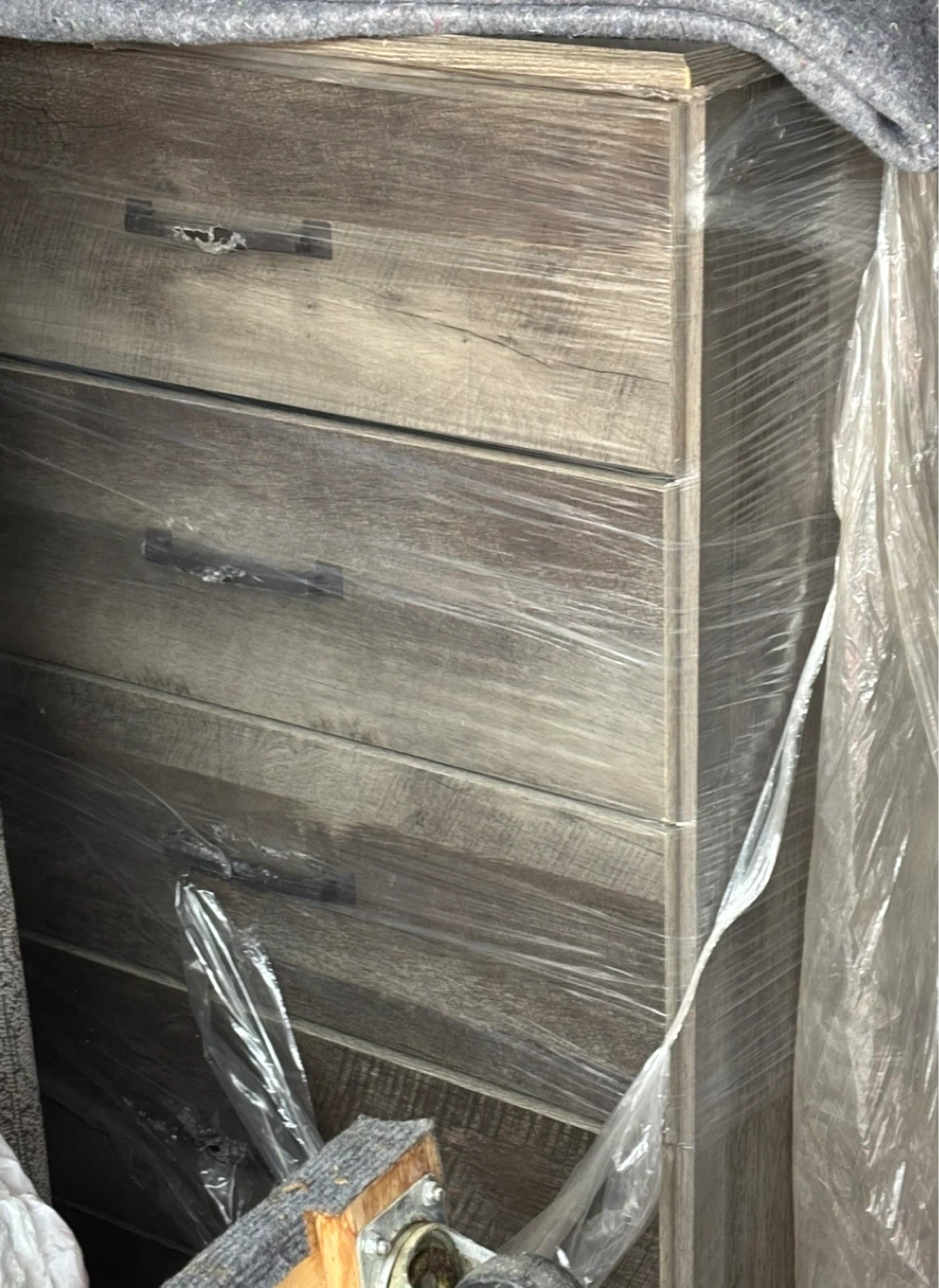 Selling a wooden dresser with four drawers. It's wrapped in plastic for protection during moving. The wood has a nice, rustic look with dark metal drawer pulls. Perfect for adding storage to any bedroom!
