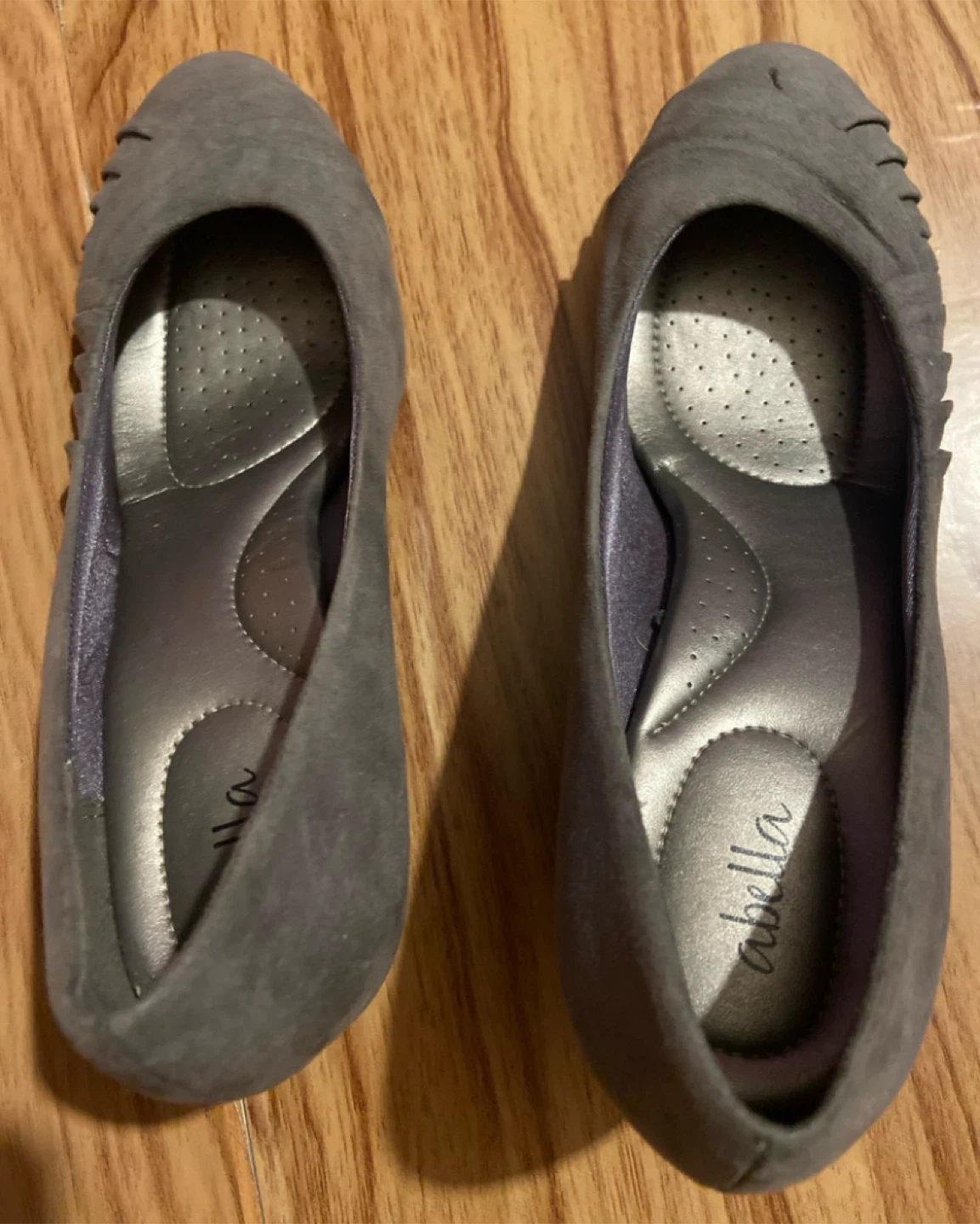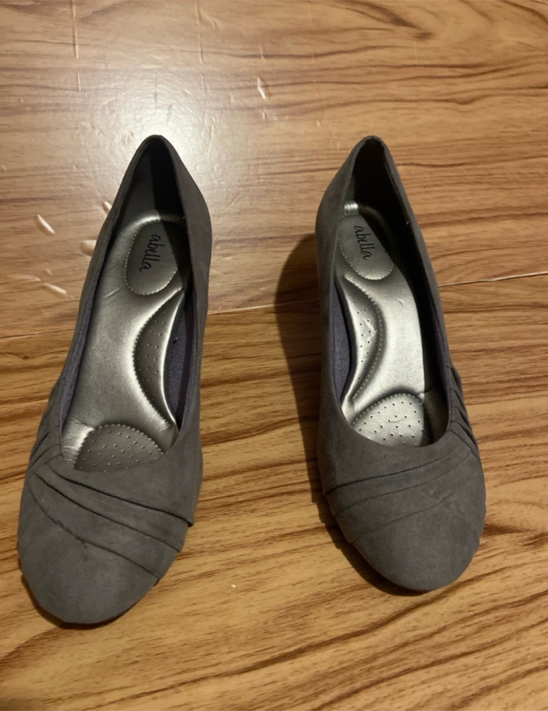 Step out in style with these Abella heels, size 9 These elegant grey heels feature a comfortable, cushioned insole and a sleek design, perfect for a day at the office or an evening out. Although they have been previously worn, they are in good condition.