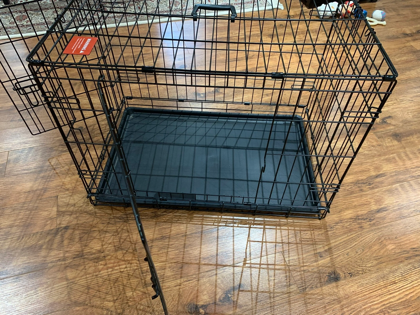 Selling a hardly used black wire dog crate with a black ad. It's in great shape and ready for a new furry friend. Perfect for training or providing a safe space for your dog at home