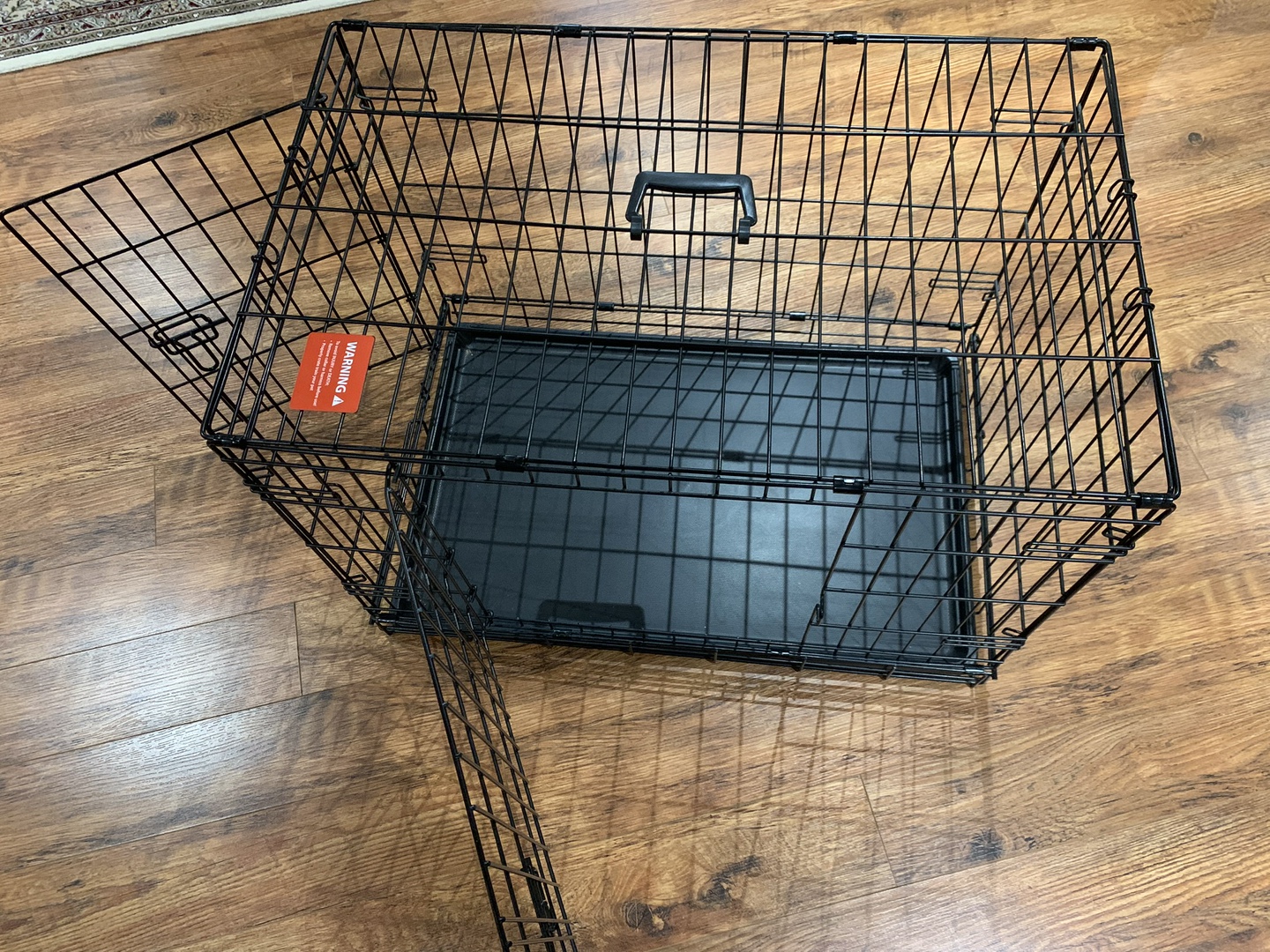 Selling a hardly used black wire dog crate with a black ad. It's in great shape and ready for a new furry friend. Perfect for training or providing a safe space for your dog at home