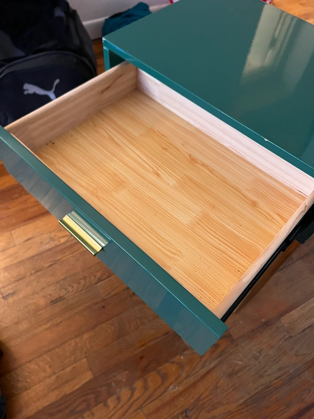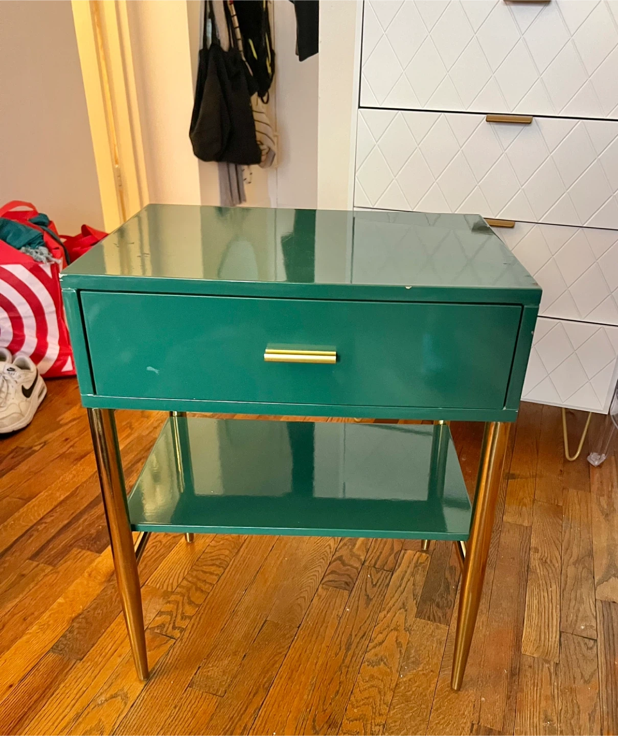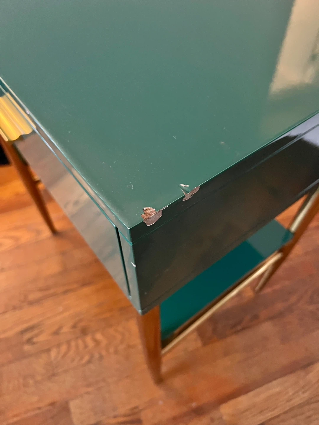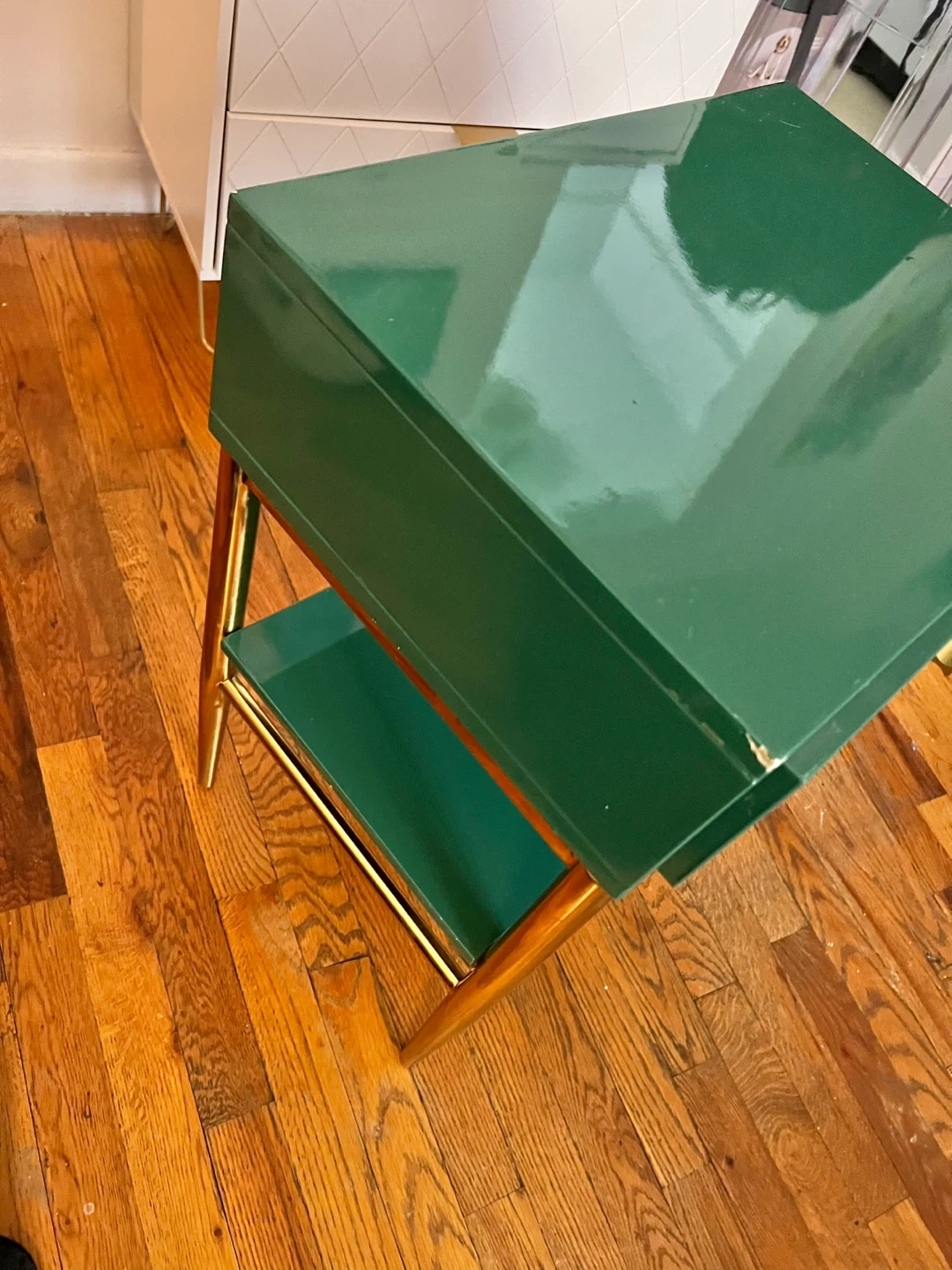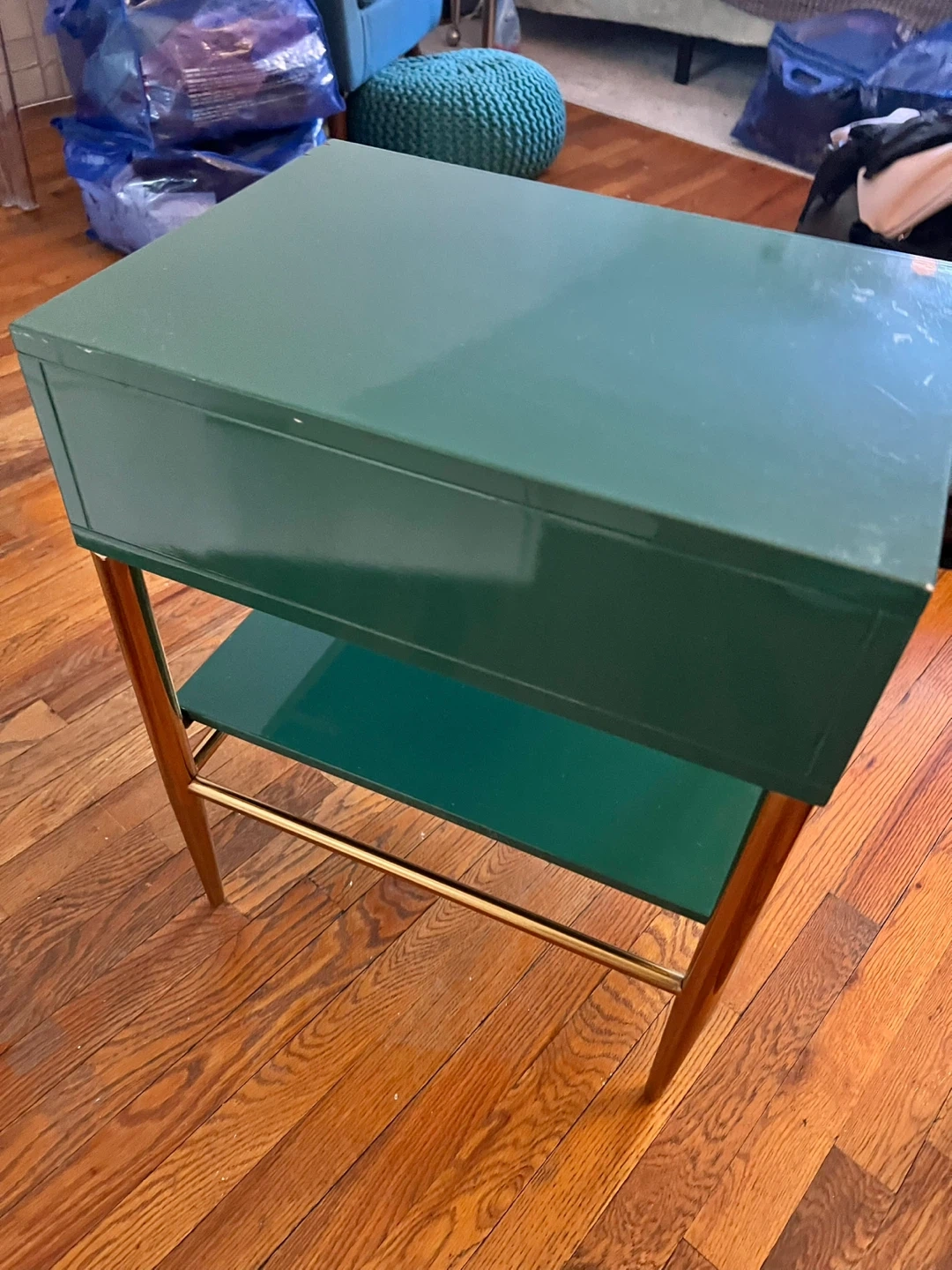 Green lacquered end table with a single drawer and a lower shelf. Features gold-toned hardware and tapered legs. Some minor scuffs on the top surface. Wood interior drawer.