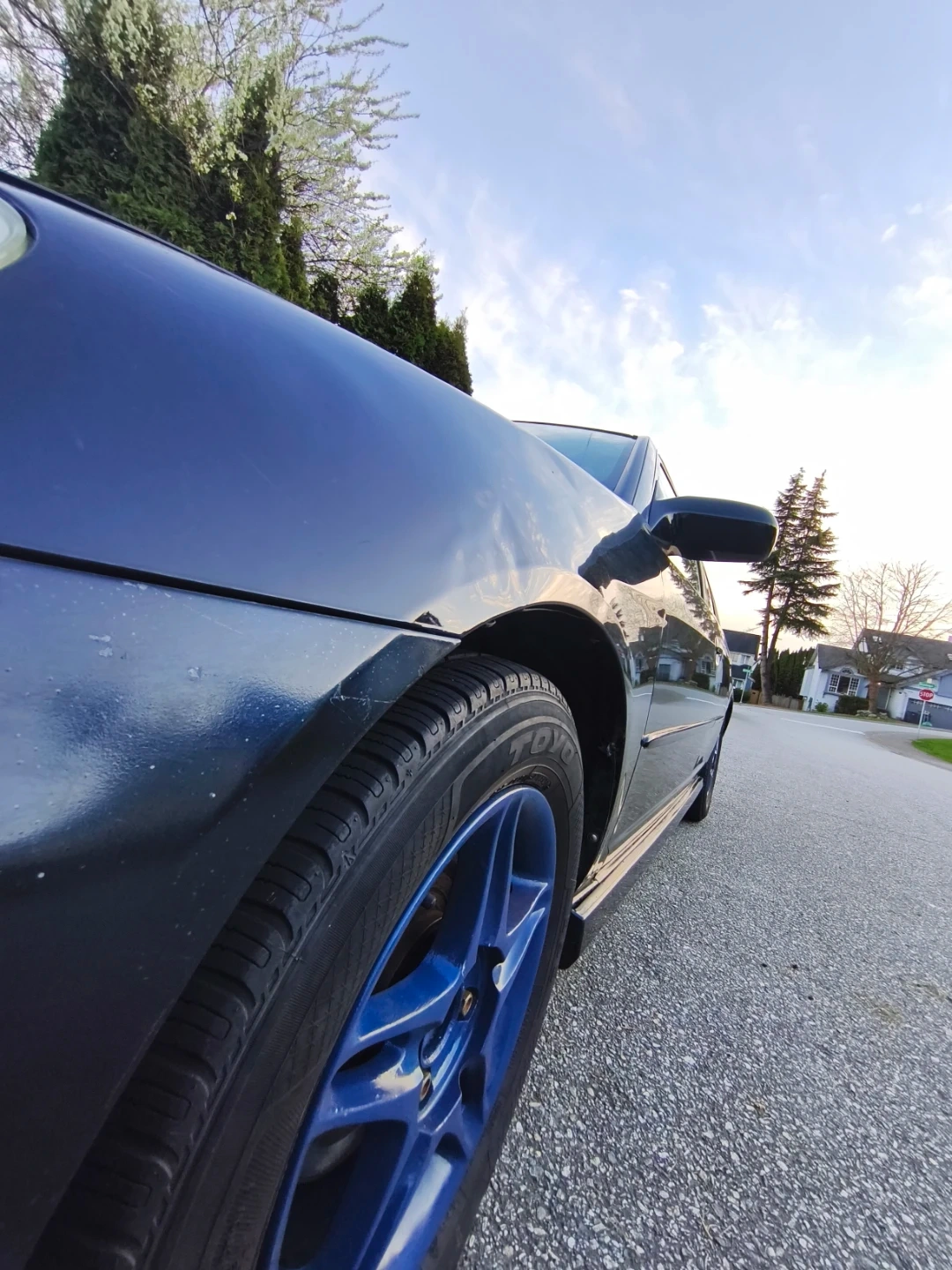 Body: There is a dent on the fender, a scratch on the rear fender, and cracks in the paint on the hood. One plastic side skirt is missing.