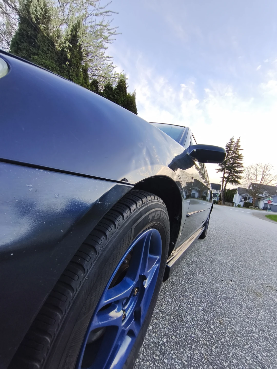 Body: There is a dent on the fender, a scratch on the rear fender, and cracks in the paint on the hood. One plastic side skirt is missing.