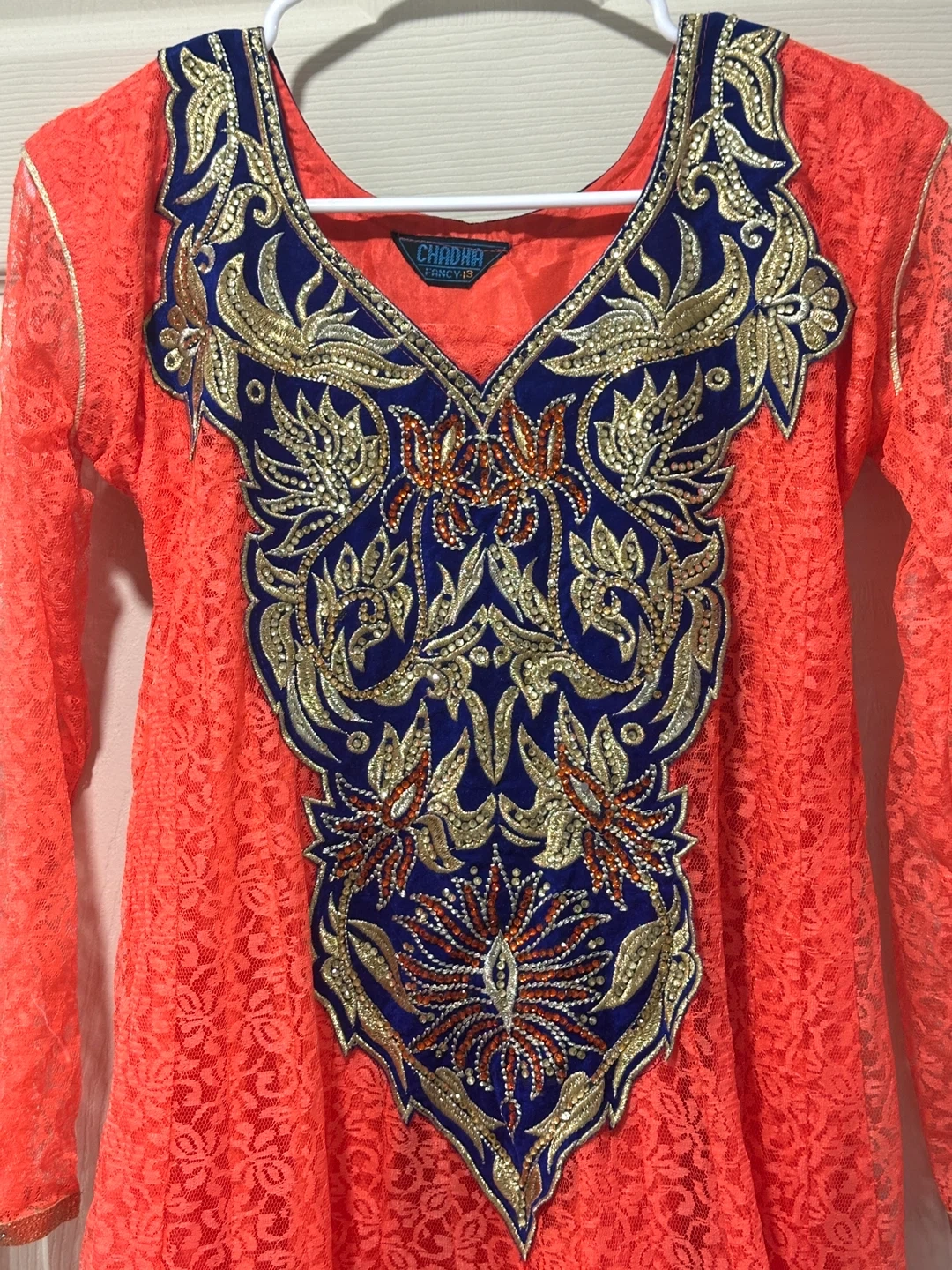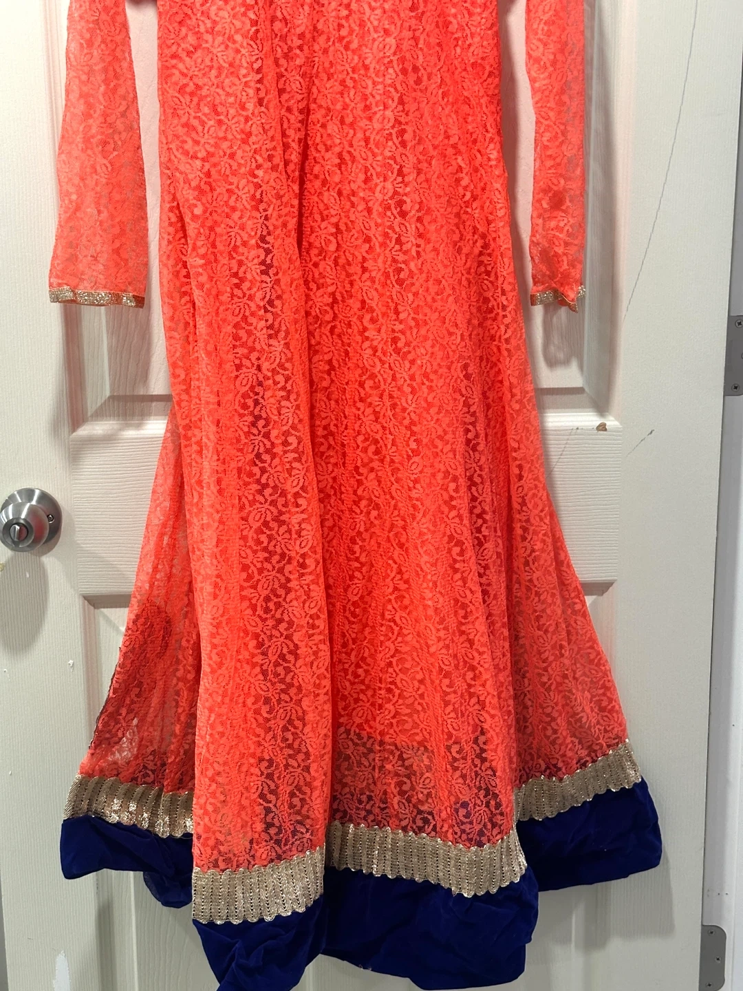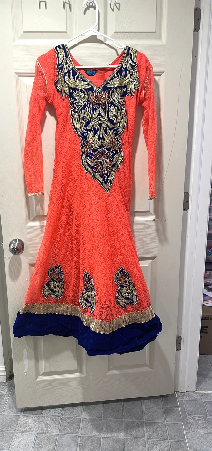 Beautiful coral coloured Anarkali dress with blue and gold embroidery. The dress features a lace overlay and is perfect for special occasions or cultural events. It's in great condition and ready for a new home! Please let me know if you require the measurements; I would be glad to provide them. Price is negotiable.