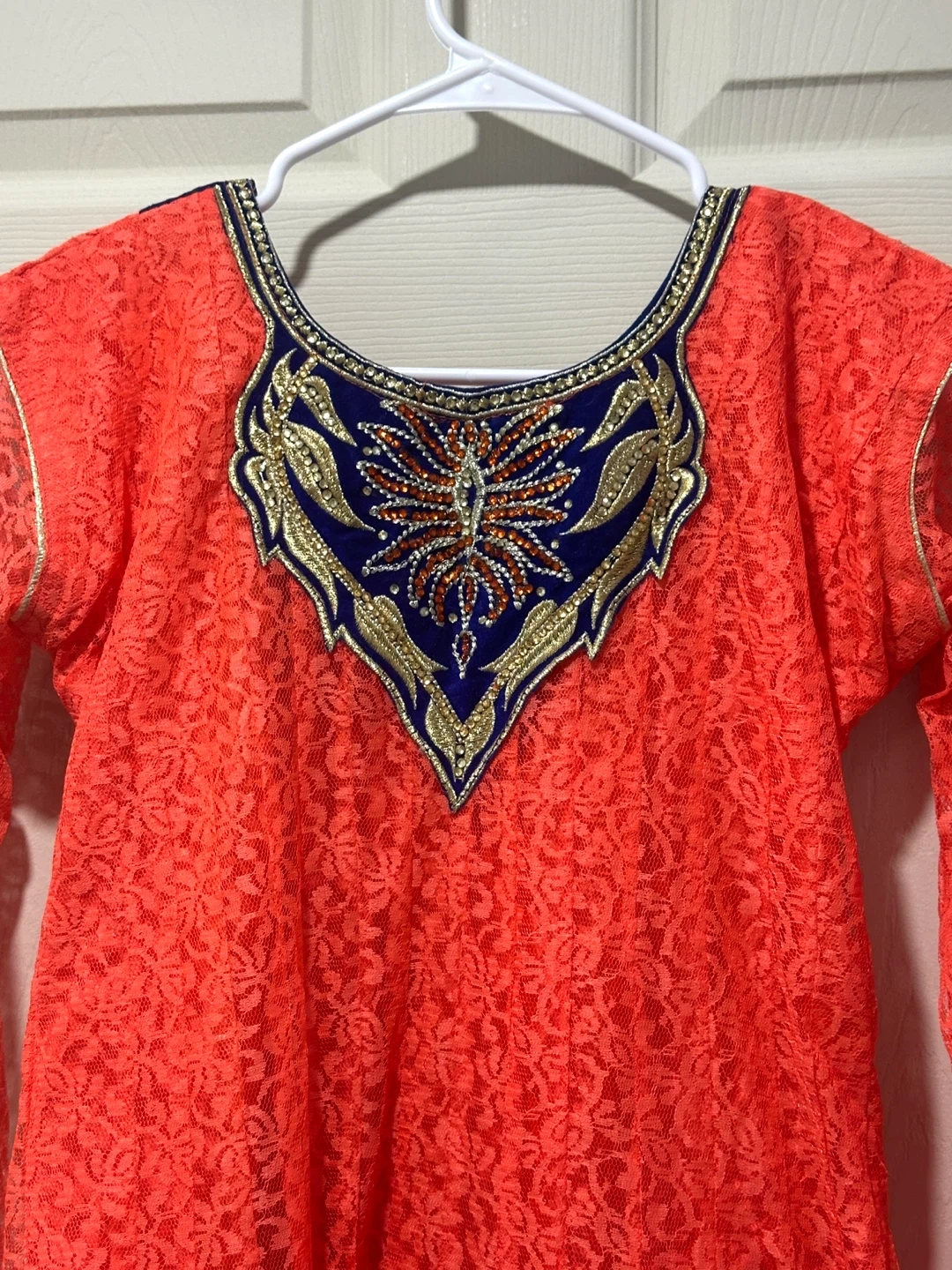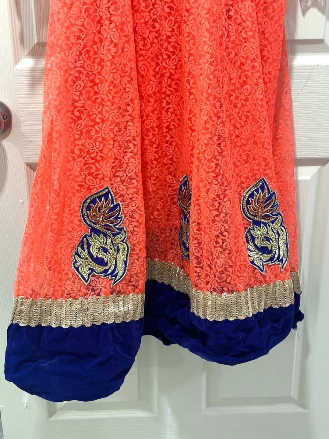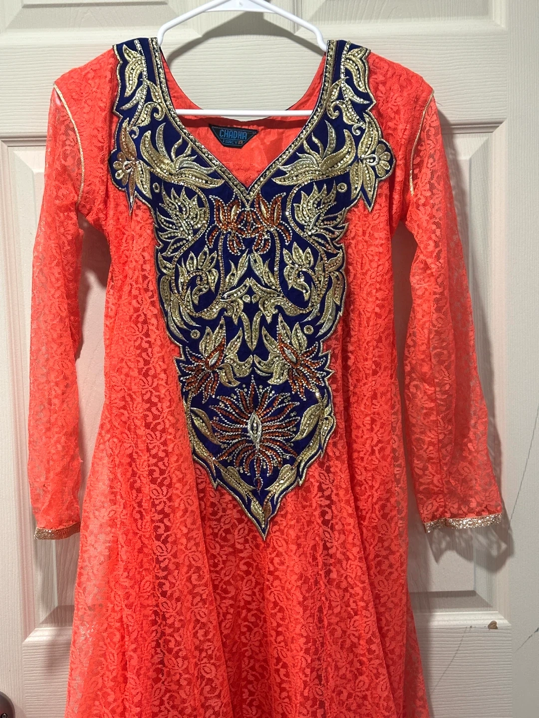 Beautiful coral coloured Anarkali dress with blue and gold embroidery. The dress features a lace overlay and is perfect for special occasions or cultural events. It's in great condition and ready for a new home! Please let me know if you require the measurements; I would be glad to provide them. Price is negotiable.
