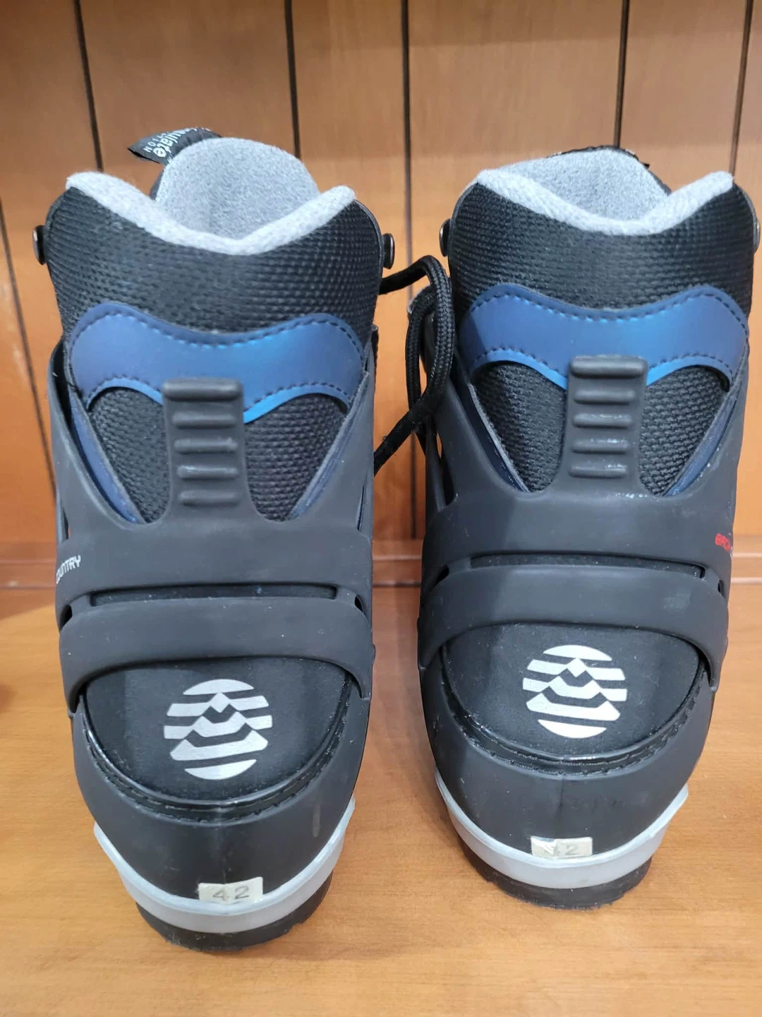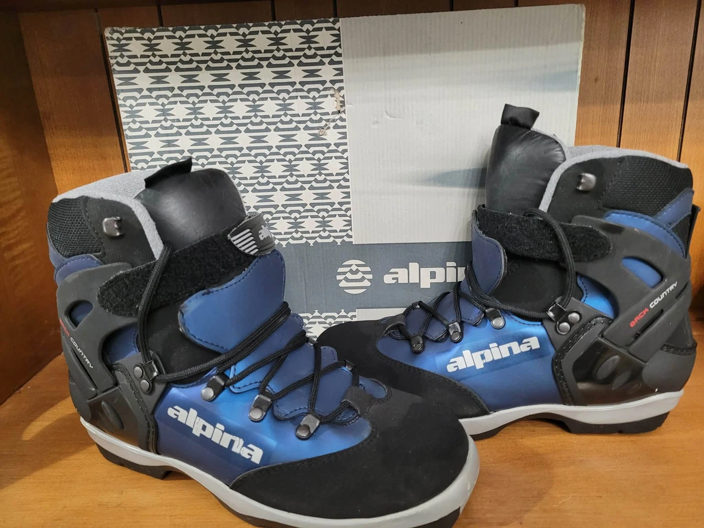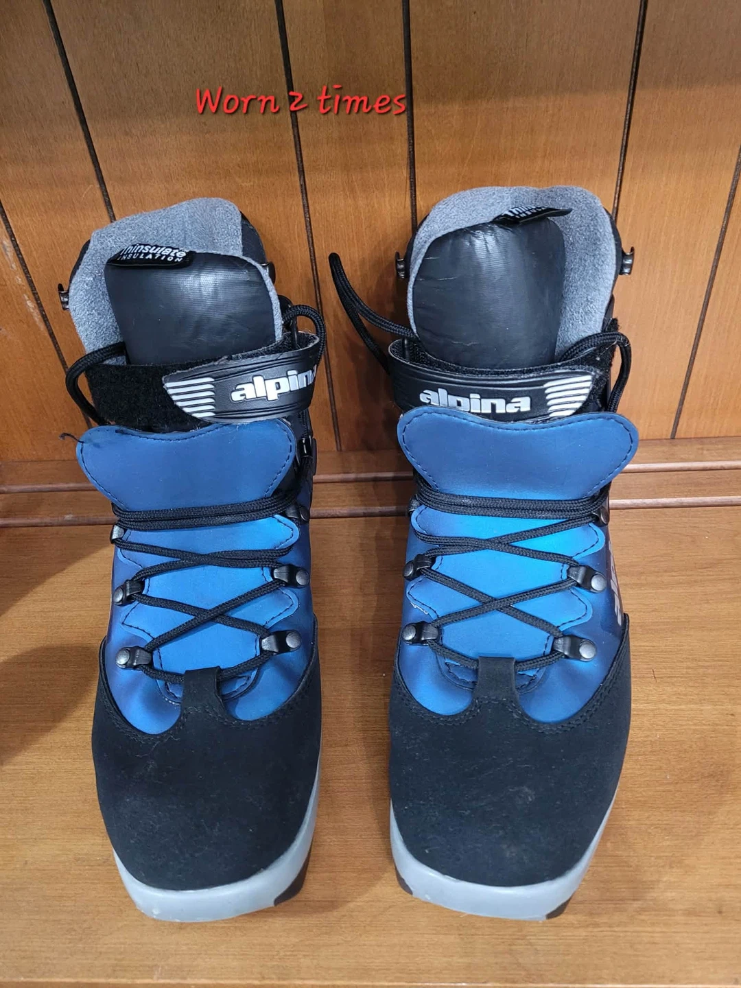These Alpina back country ski boots are a size US 9.5. They're black and blue with a durable design for off-trail skiing. Includes the original box and packaging.