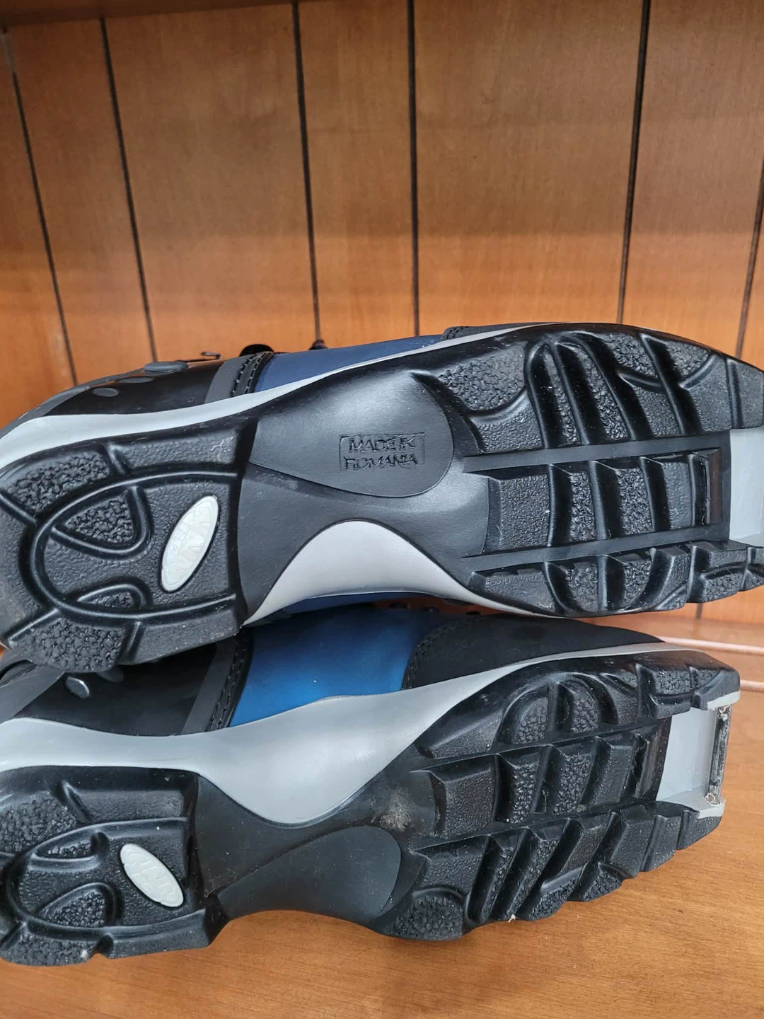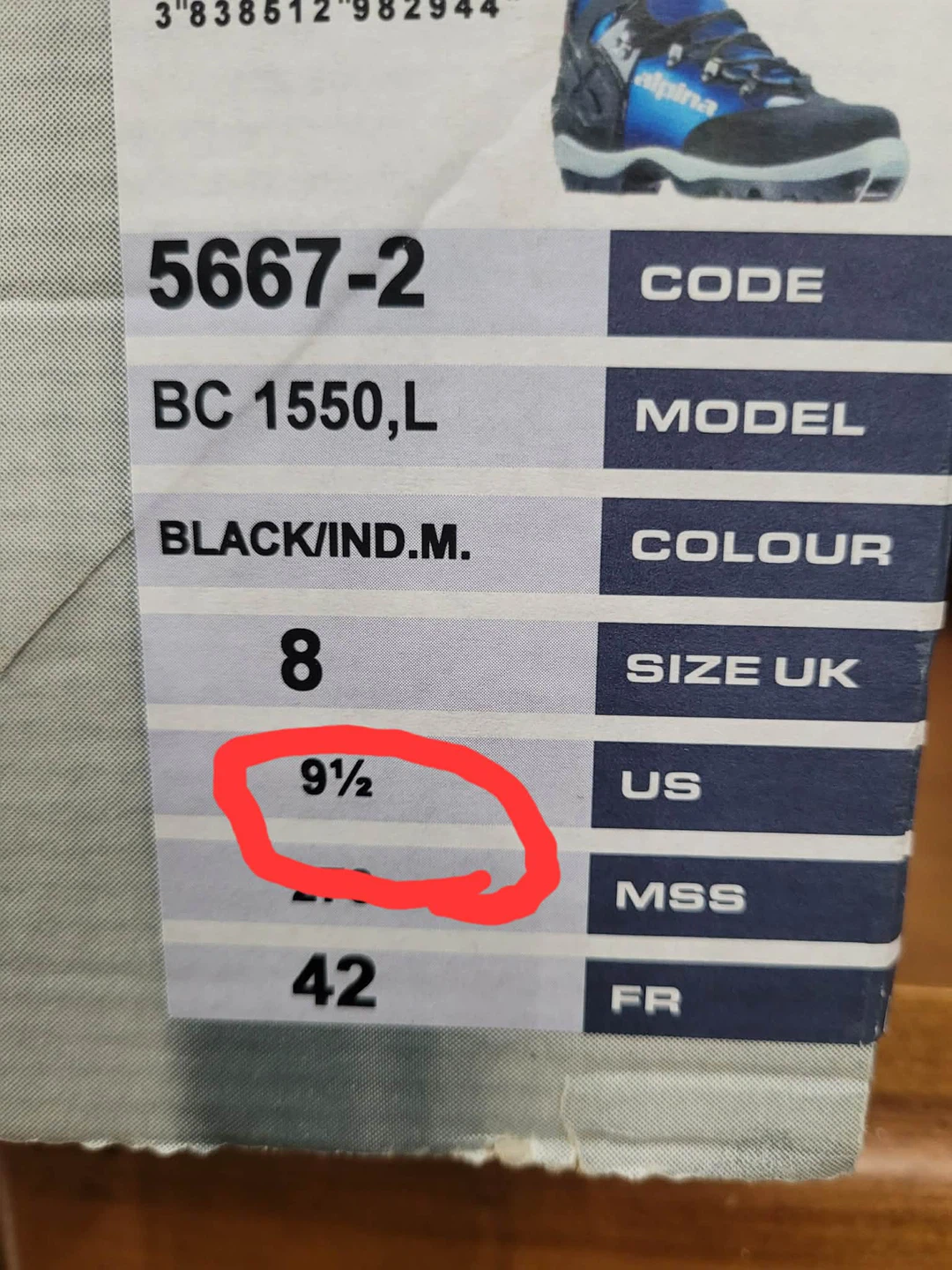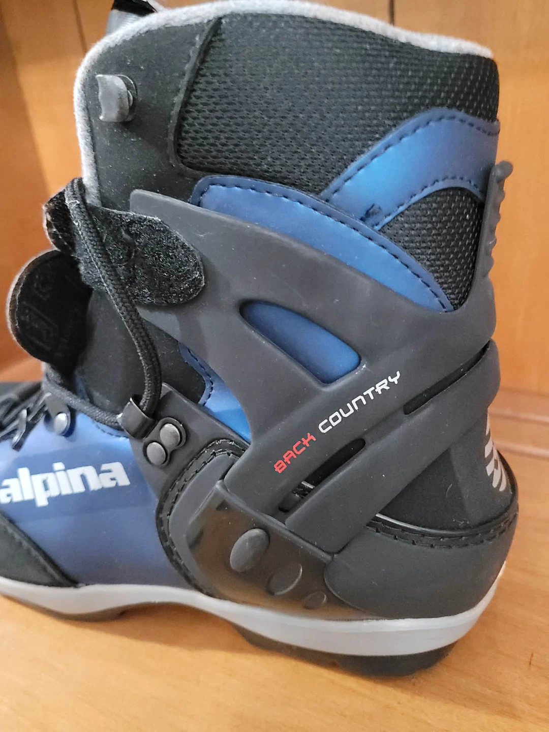 These Alpina back country ski boots are a size US 9.5. They're black and blue with a durable design for off-trail skiing. Includes the original box and packaging.
