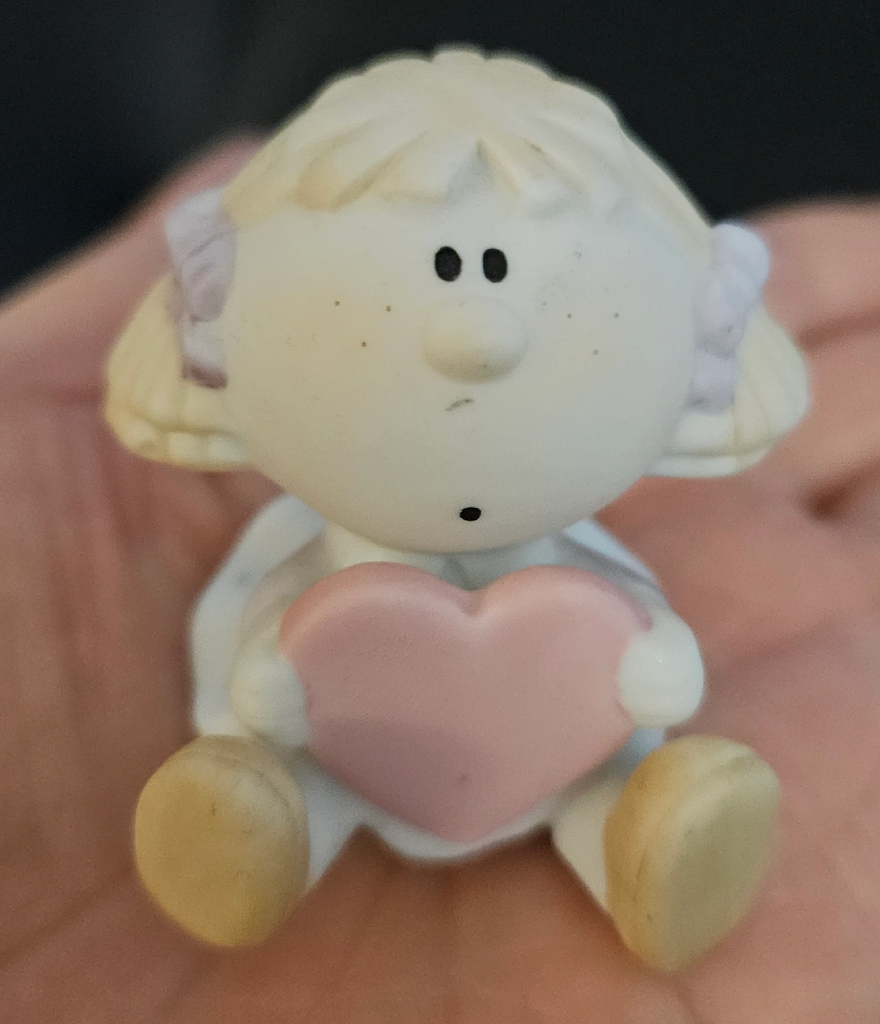 A cute Bumpkins figurine made by Cast Art in 1996! It features a little angel holding a pink heart. Palm Size. This piece is in good condition and would make a lovely addition to any collection or a sweet gift