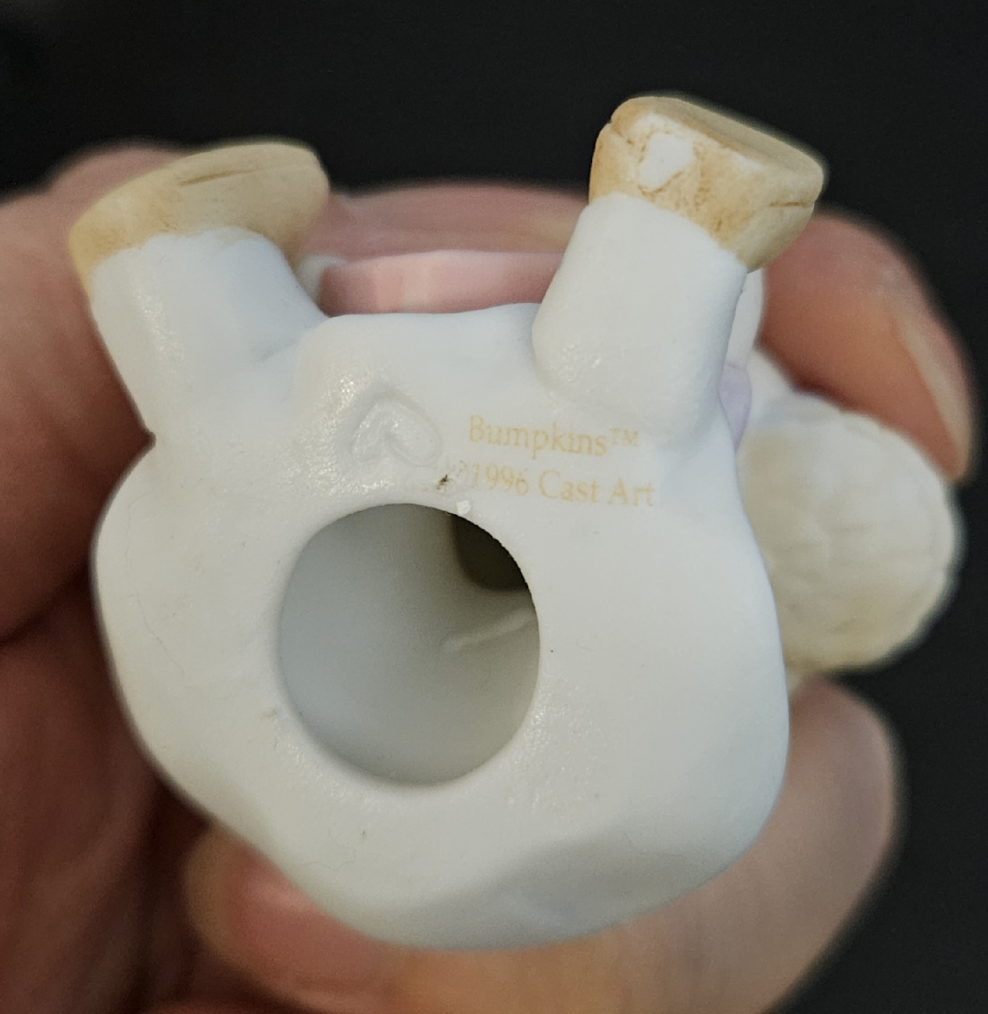 A cute Bumpkins figurine made by Cast Art in 1996! It features a little angel holding a pink heart. Palm Size. This piece is in good condition and would make a lovely addition to any collection or a sweet gift