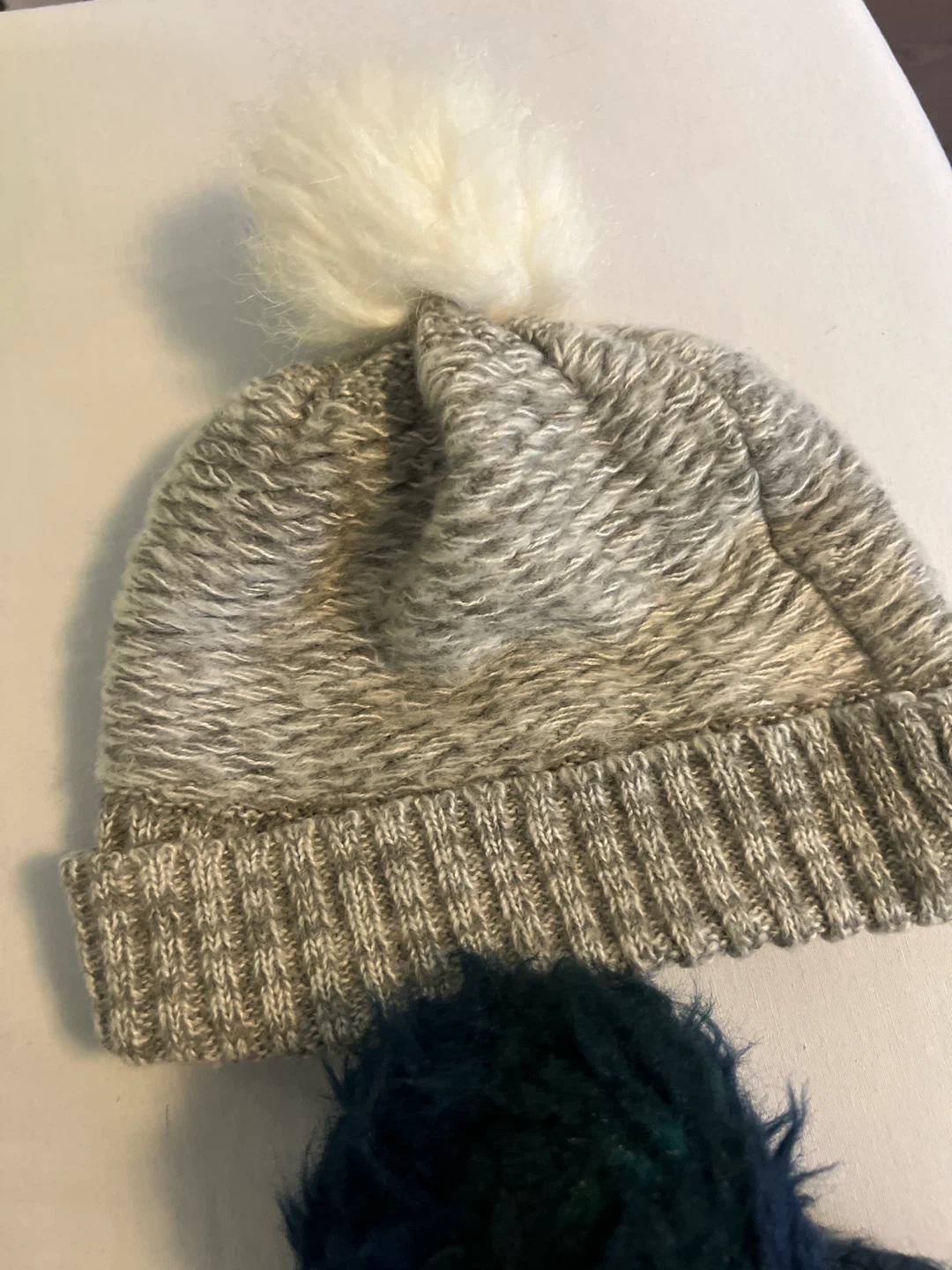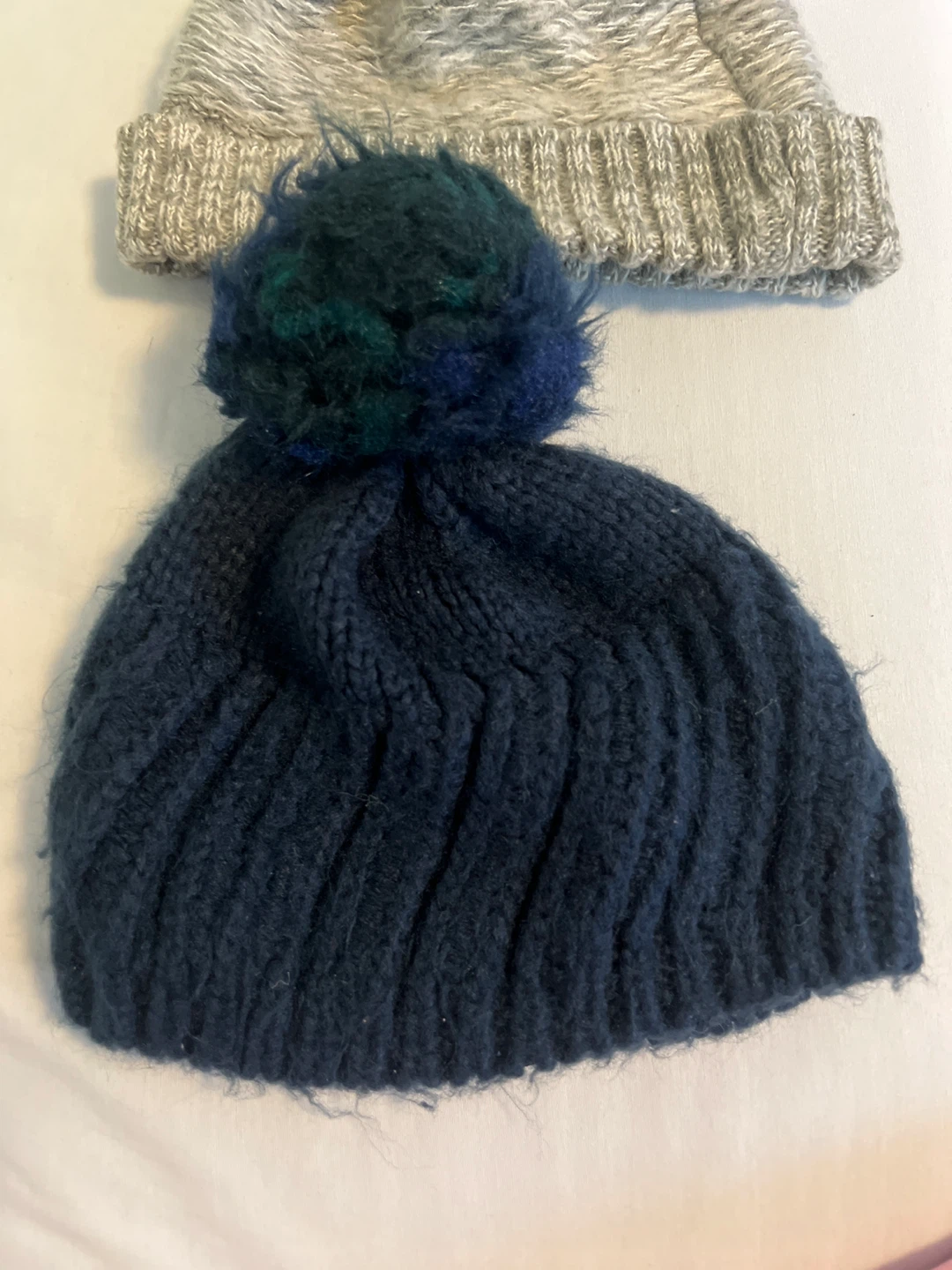 Selling two knitted hats! One is a dark blue with a pompom, and the other is a grey knit. Both are in good condition and ready to keep you warm this winter