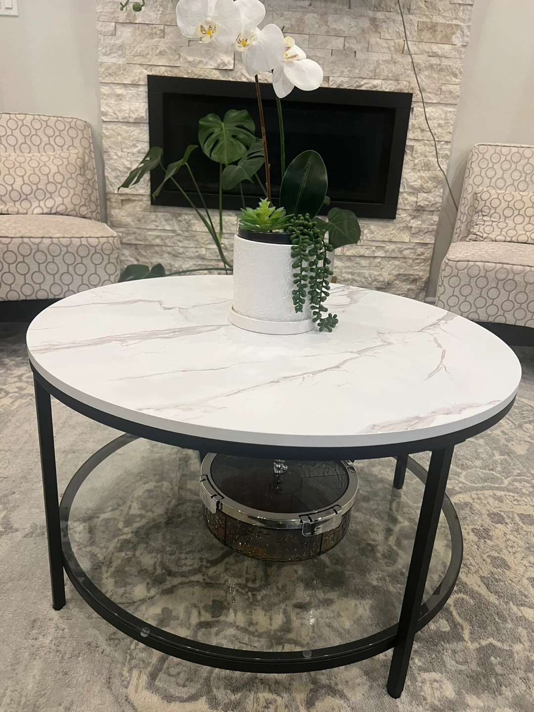 Selling a round coffee table with a white marble-patterned top and black metal legs. It has a modern look and would be a great addition to any living room!