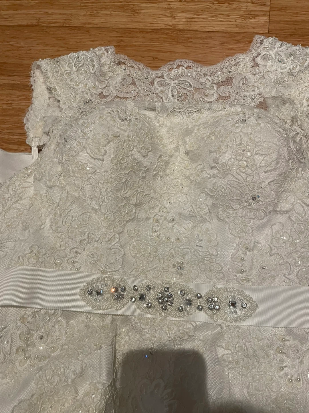 Beautiful white lace wedding dress. It is in great condition and ready for its next special day!