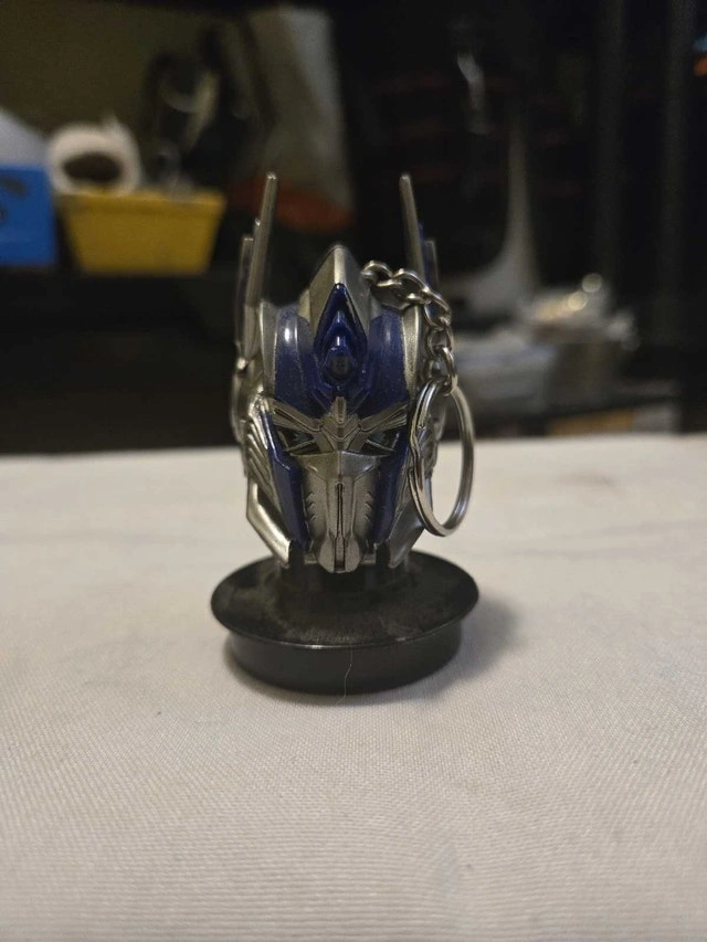 This is a used Transformers Optimus Prime keychain, featuring the head of the iconic Autobot leader. It's a great collectible for any Transformers fan! Please note that, as a used item, it shows some signs of wear, which adds to its character. I think it's a great addition to your collection. If the ad is still up, then yes, it's still available!