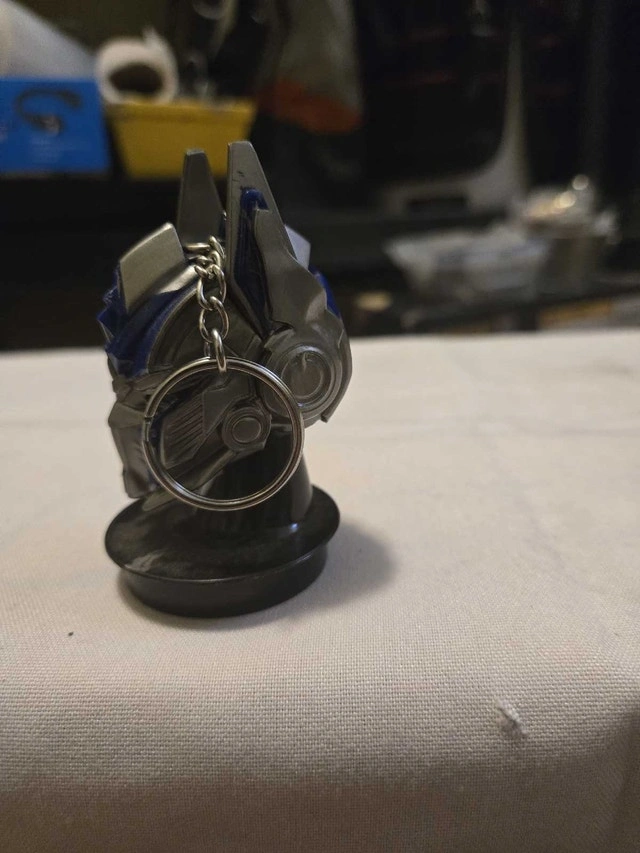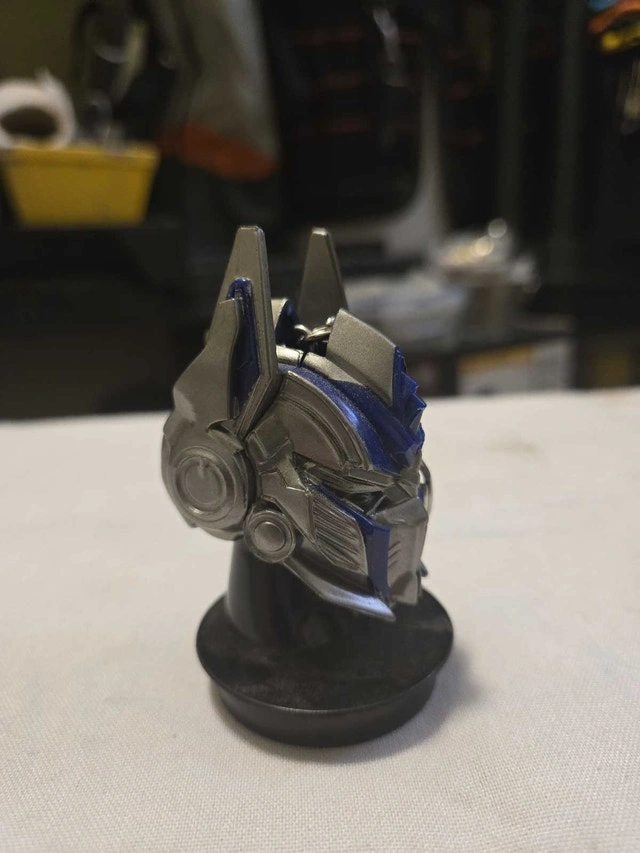 This is a used Transformers Optimus Prime keychain, featuring the head of the iconic Autobot leader. It's a great collectible for any Transformers fan! Please note that, as a used item, it shows some signs of wear, which adds to its character. I think it's a great addition to your collection. If the ad is still up, then yes, it's still available!