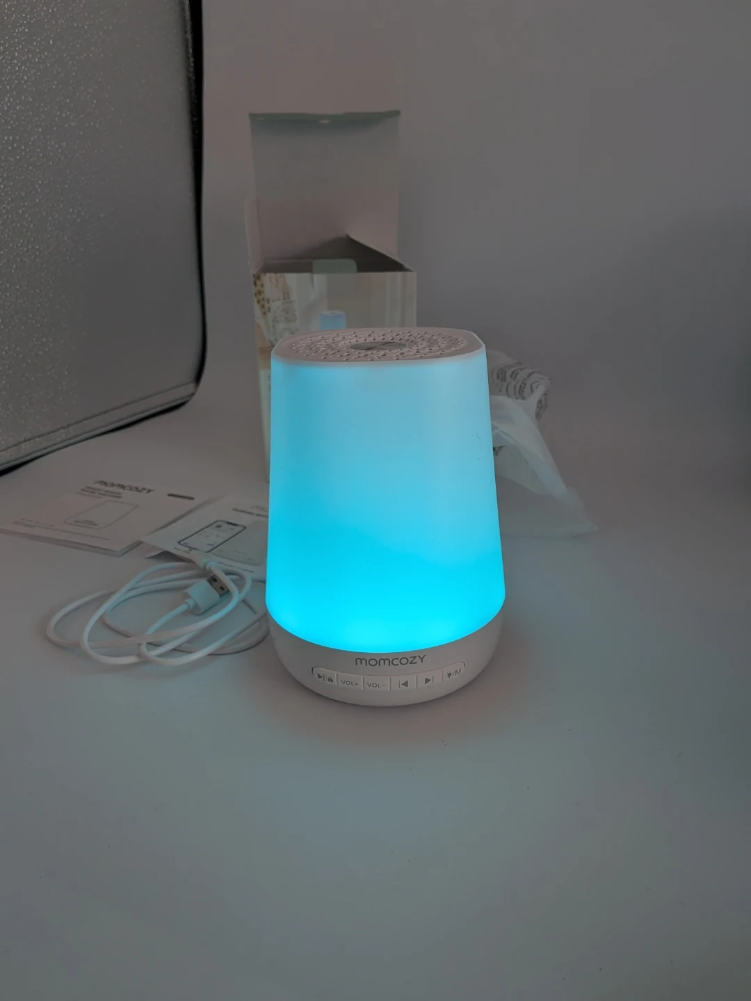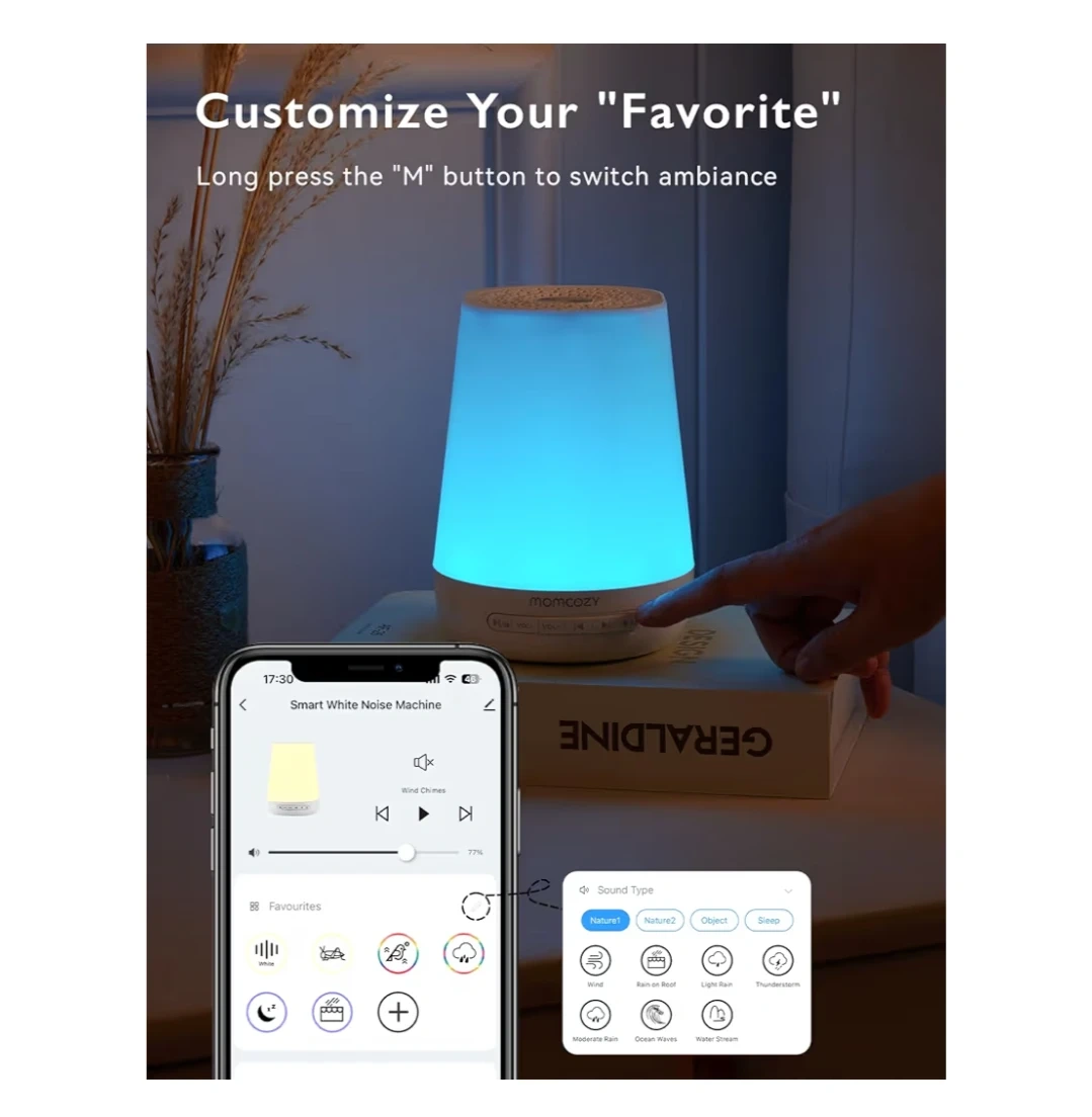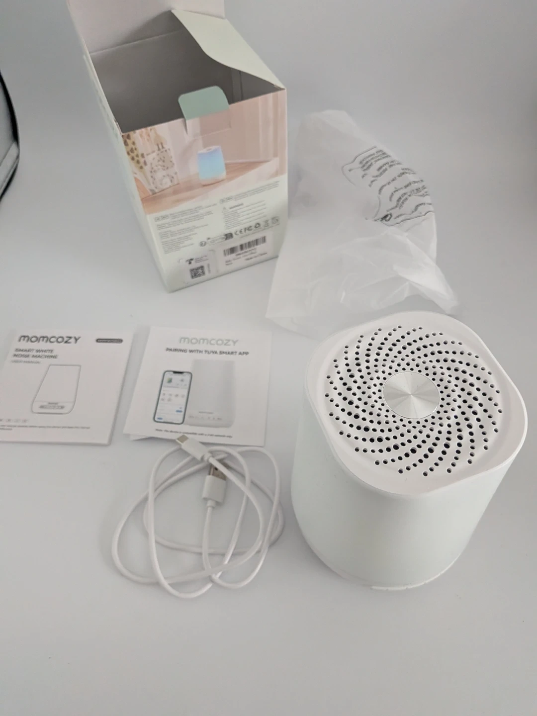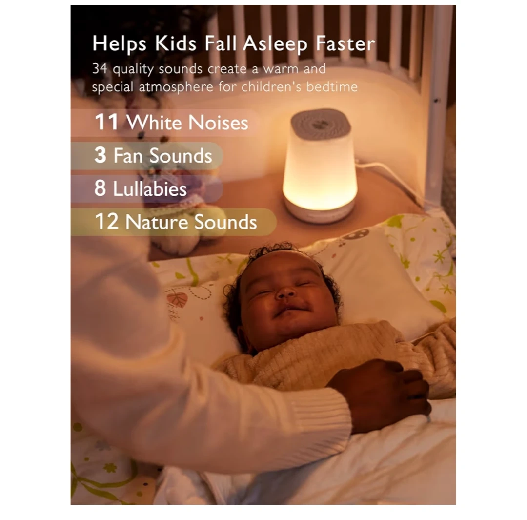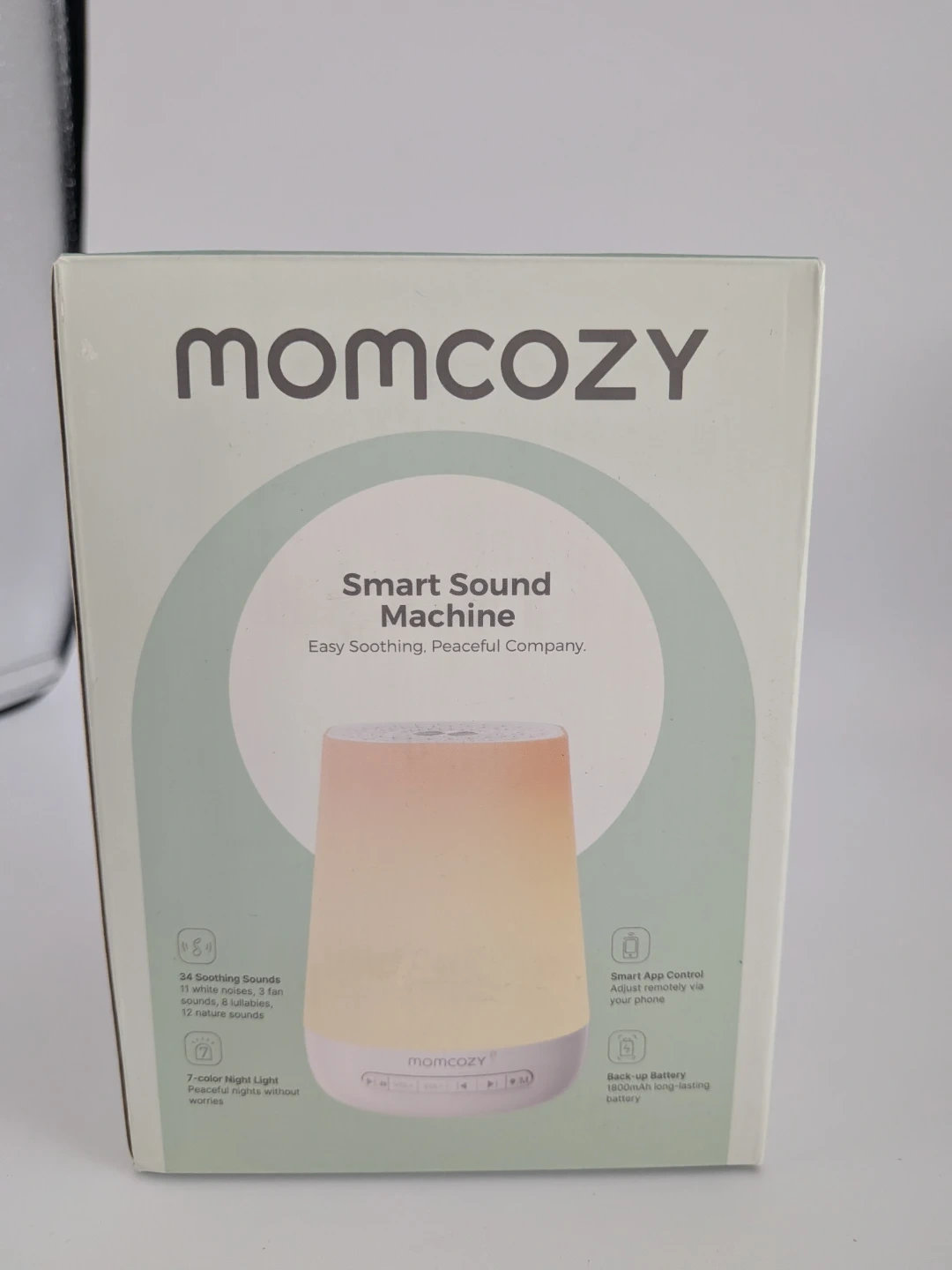 This new open box Momcozy white noise machine offers 34 soothing sounds and customizable light settings. It features app remote control for easy operation and includes 11 white noises, 3 fan sounds, 8 lullabies, and 12 nature sounds. It also has a child lock and program reminder functions.