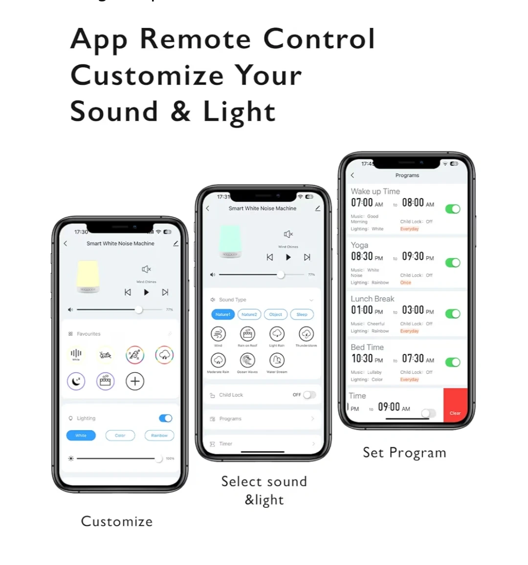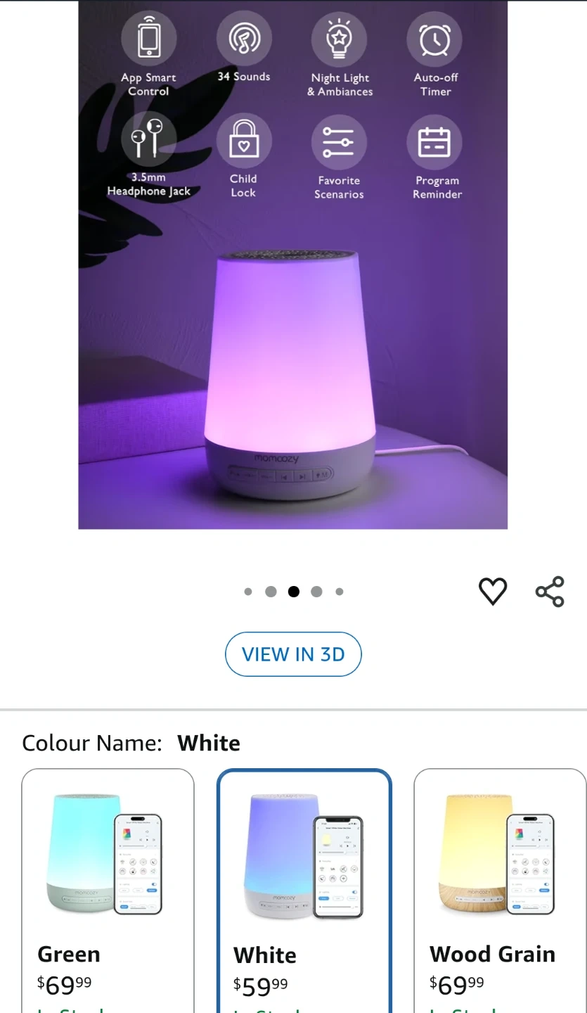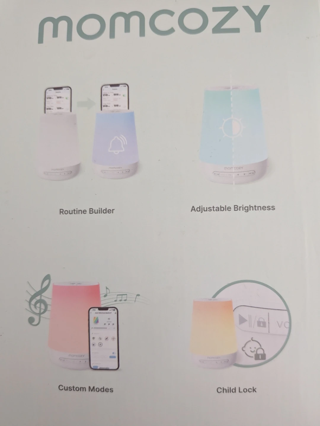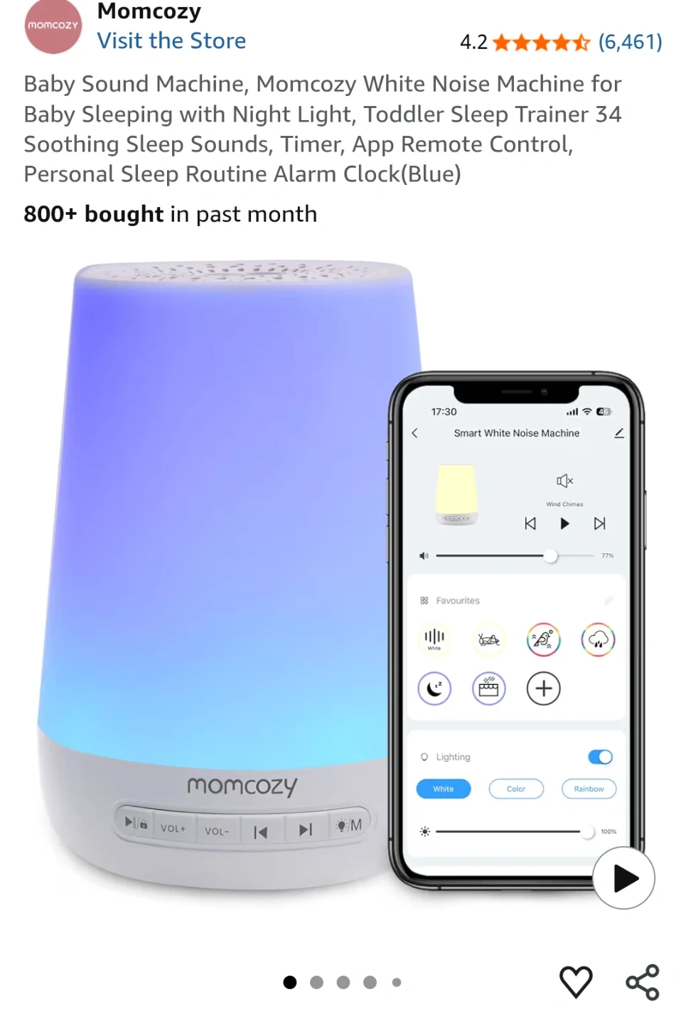 This new open box Momcozy white noise machine offers 34 soothing sounds and customizable light settings. It features app remote control for easy operation and includes 11 white noises, 3 fan sounds, 8 lullabies, and 12 nature sounds. It also has a child lock and program reminder functions.