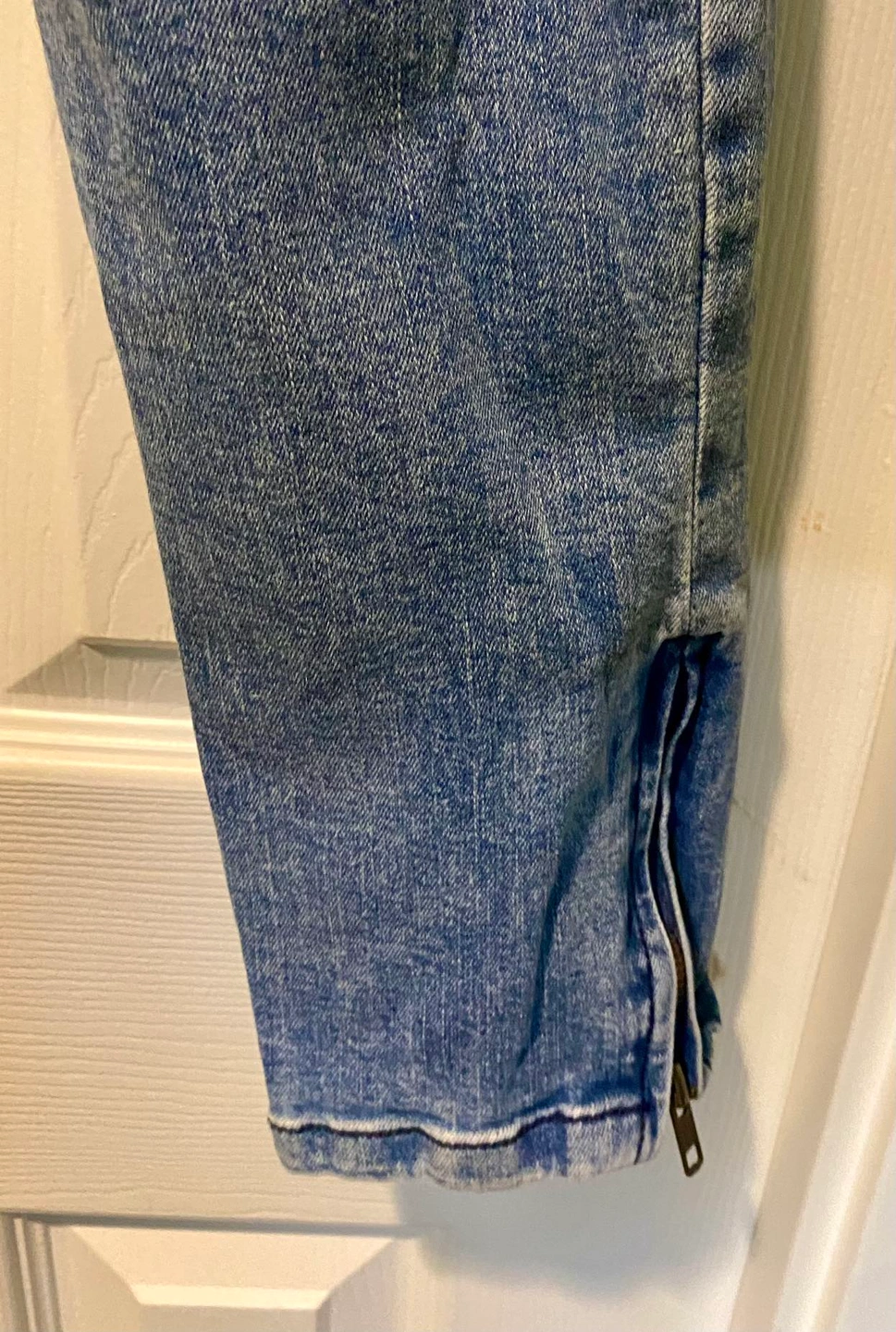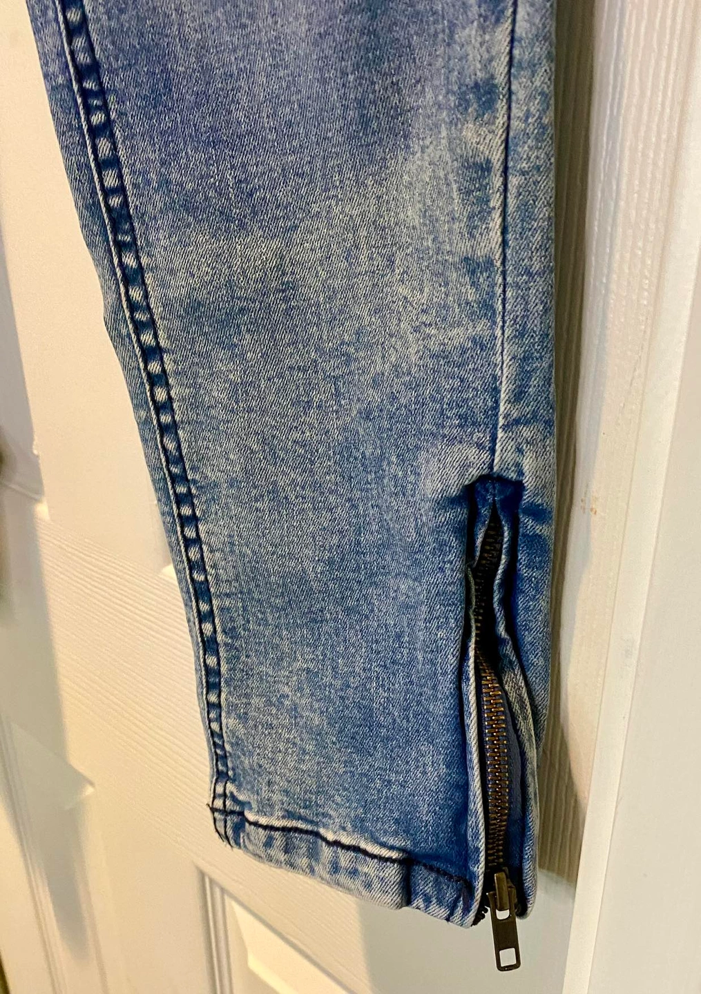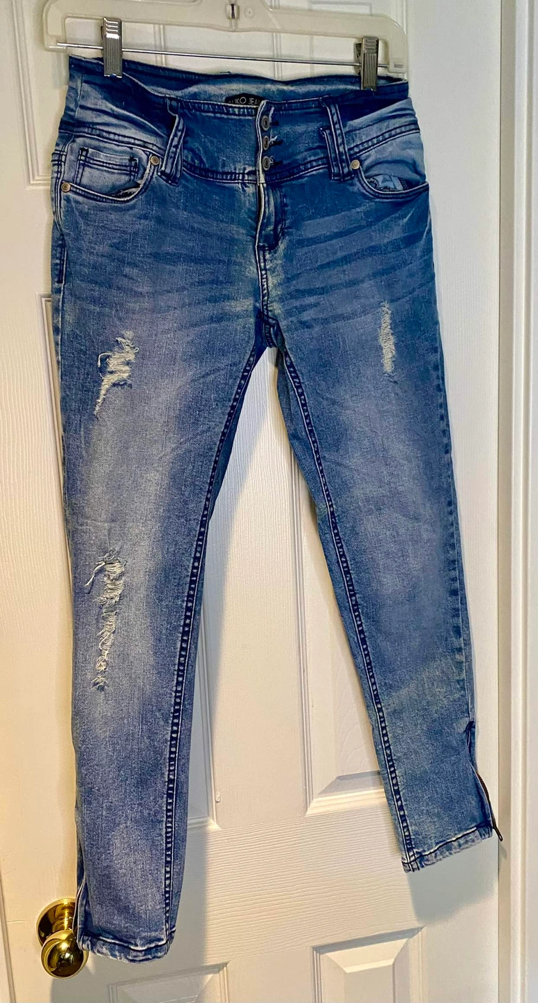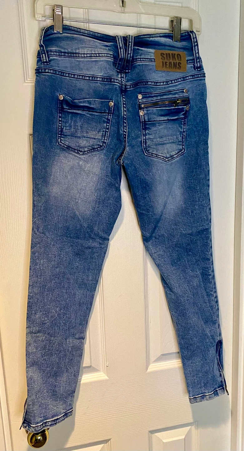 Women’s Design Stunning Suko Jeans w Zippers - slim/skinny fit size 27, may fit 26…light blue with fading, tear accents with Zippers at the bottom and rear pocket, length approx 1-2 inches above ankle depending on your height. Hot for Spring Summer !