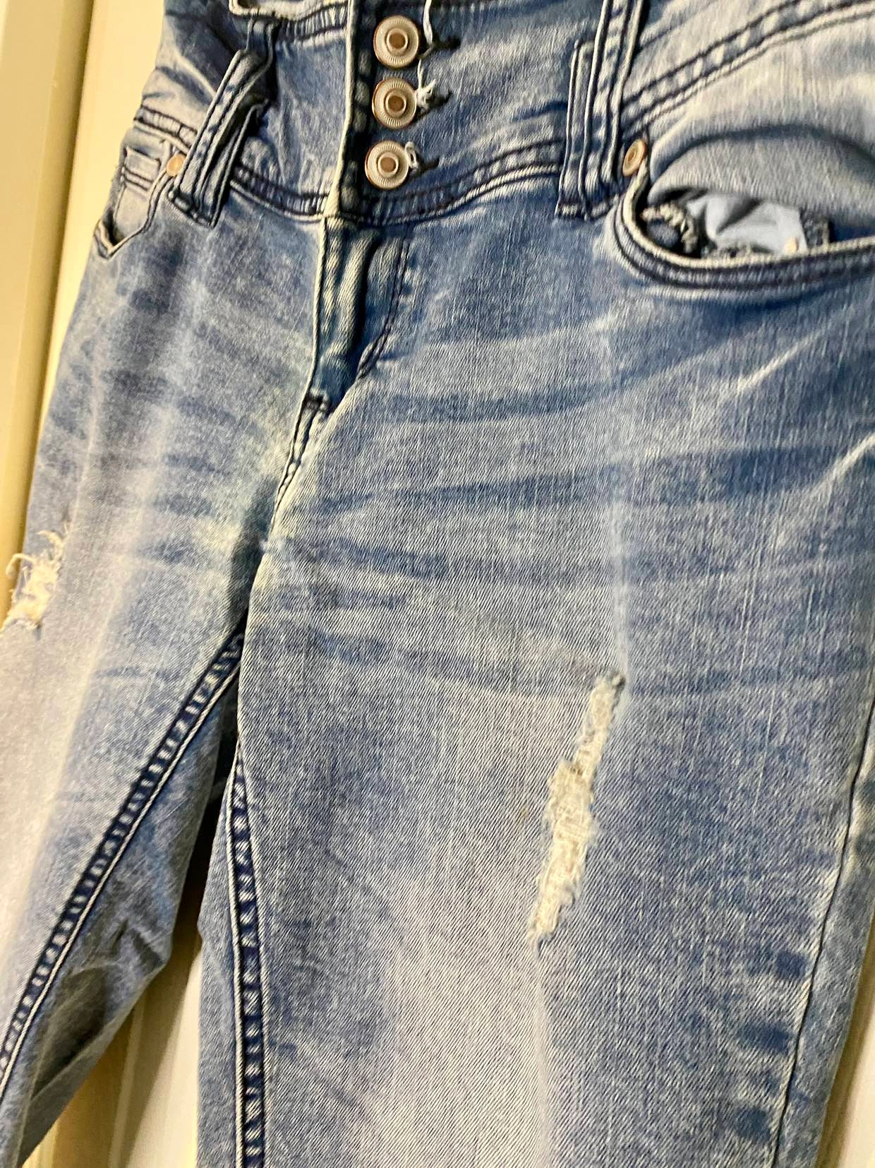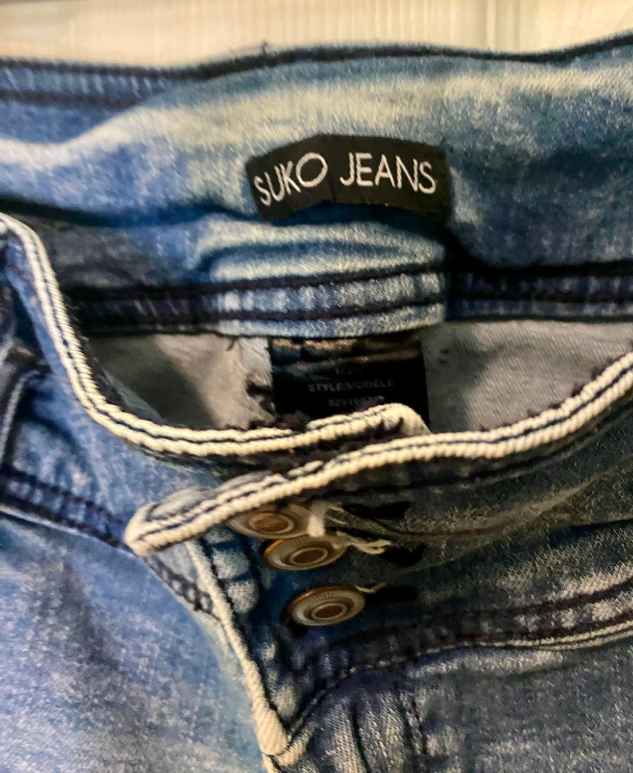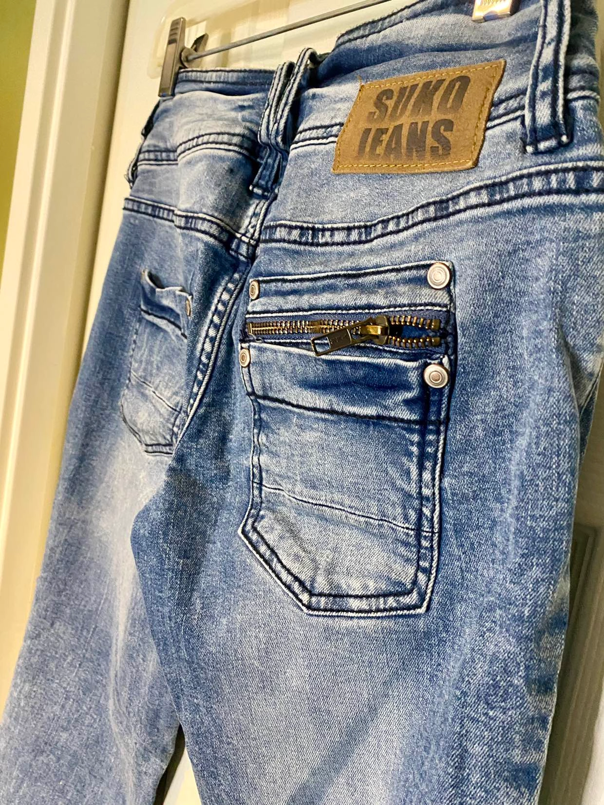 Women’s Design Stunning Suko Jeans w Zippers - slim/skinny fit size 27, may fit 26…light blue with fading, tear accents with Zippers at the bottom and rear pocket, length approx 1-2 inches above ankle depending on your height. Hot for Spring Summer !