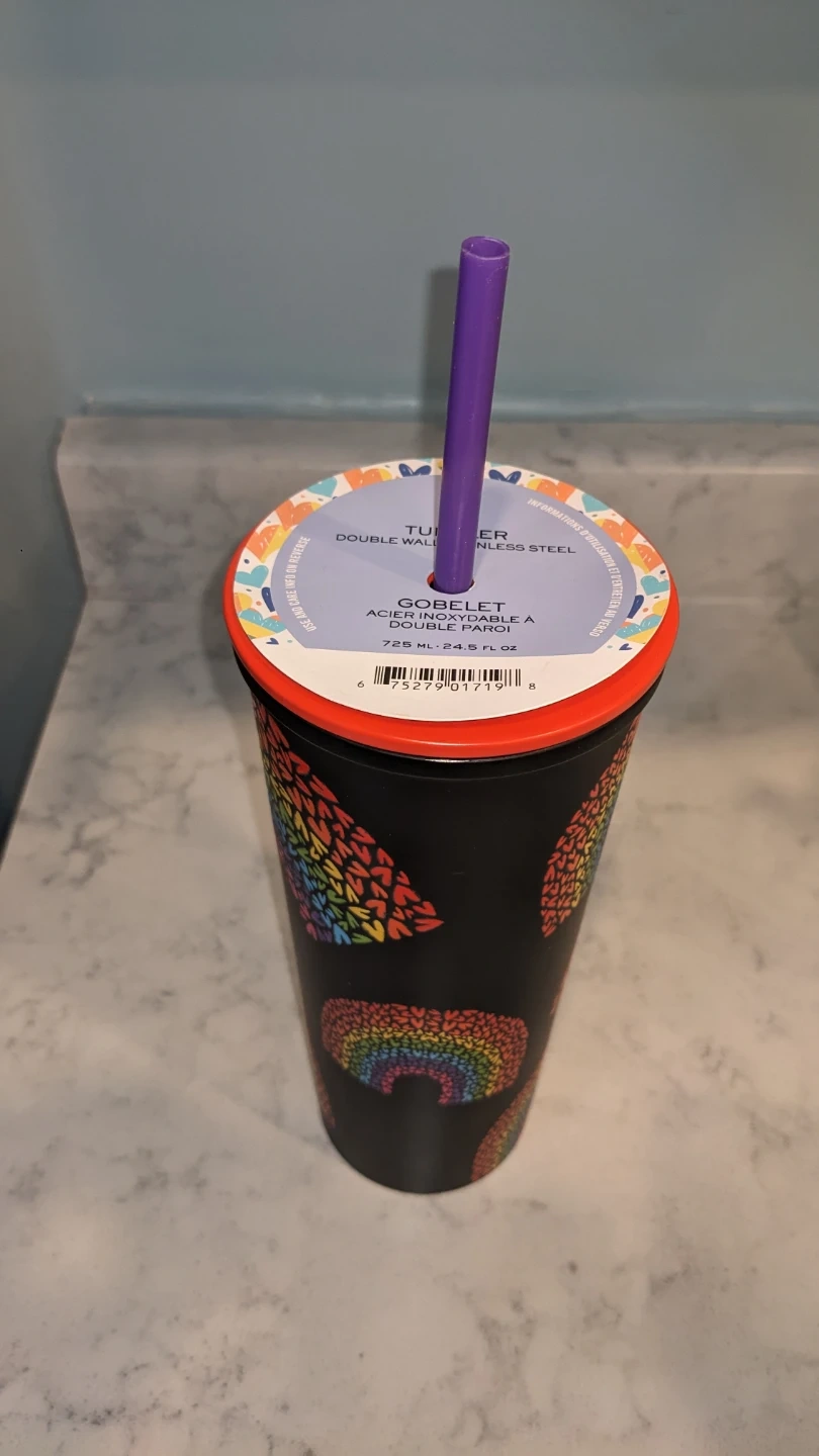 This double-wall stainless steel tumbler holds 725 mL or 24.5 fl oz. It comes with a purple reusable straw. The tumbler's exterior features a rainbow design.
