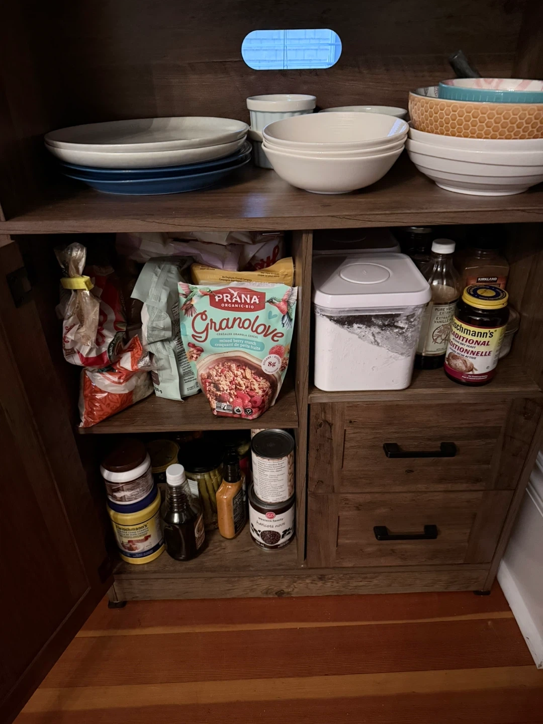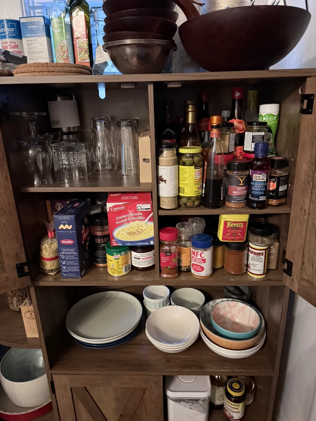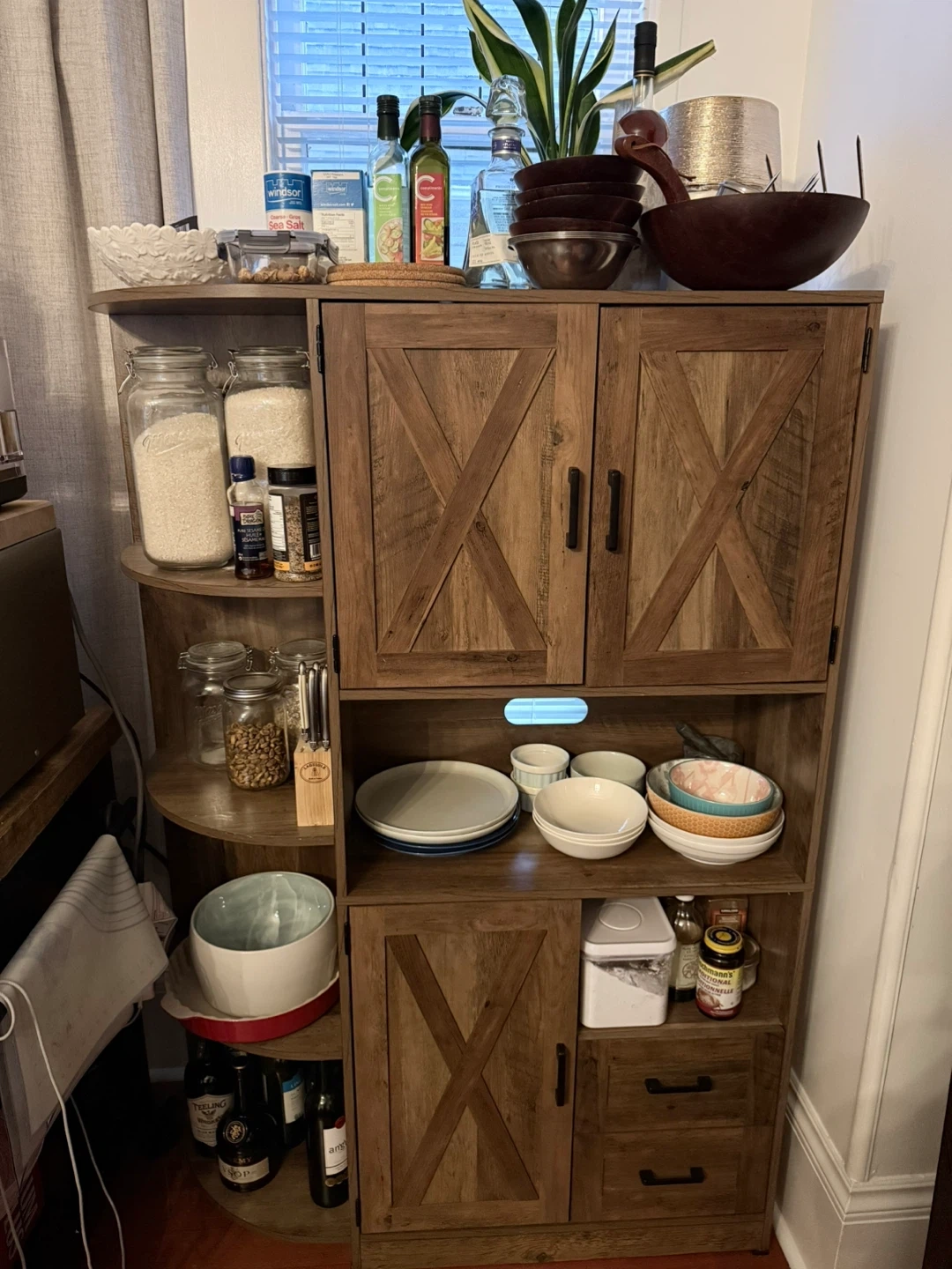 This kitchen pantry has farm doors and a microwave shelf. It Includes a drawer and multiple shelves for storage. Last picture is from the Wayfair site with the dimensions.
