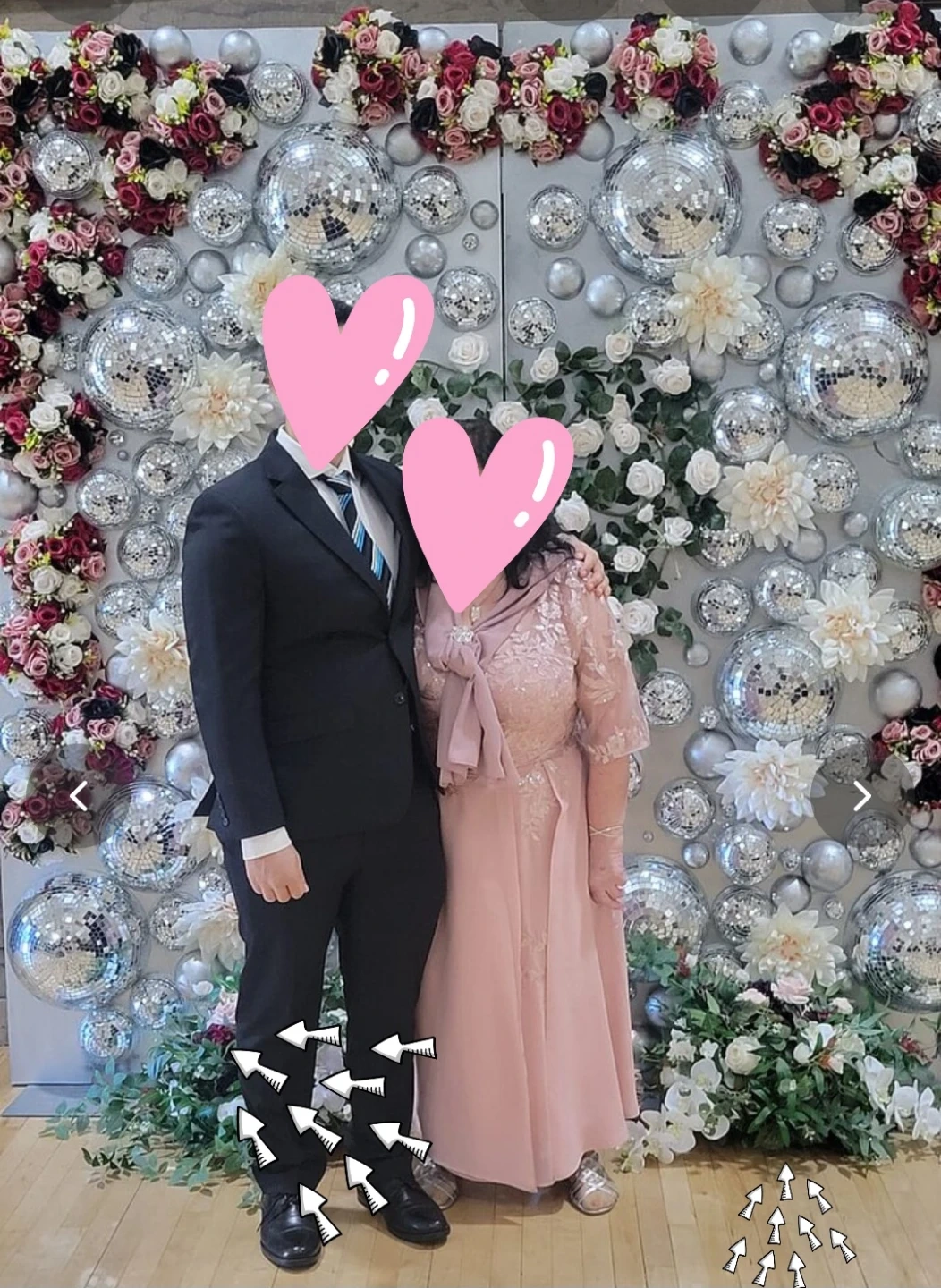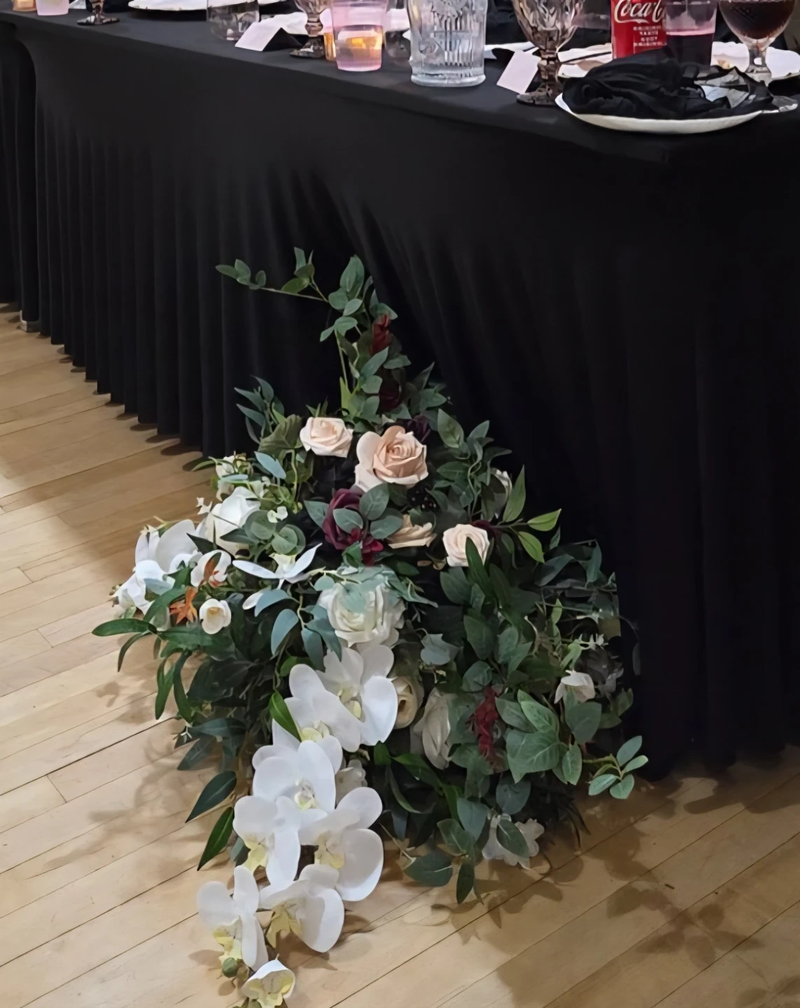 2 beautiful, large, white floral centerpieces. All white but I added some colour at my wedding.
