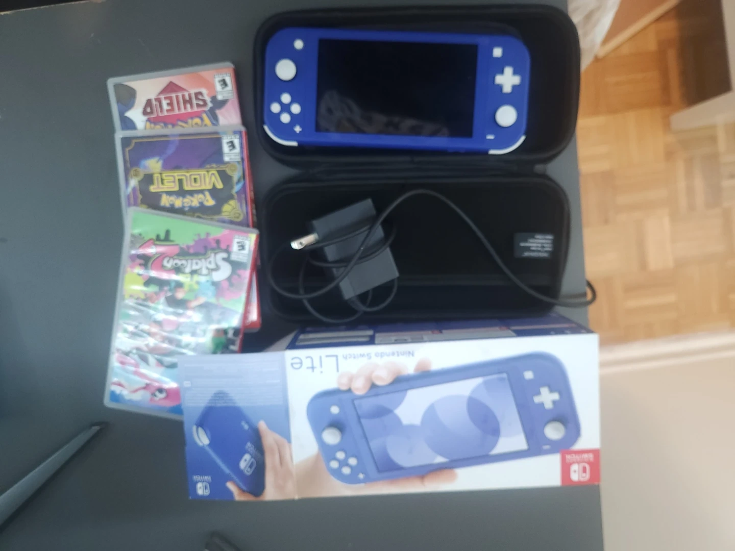 Blue Nintendo Switch Lite console. Includes original box, charger, and a protective case. Also includes Splatoon 2, Pokémon Violet, and Pokémon Shield games.