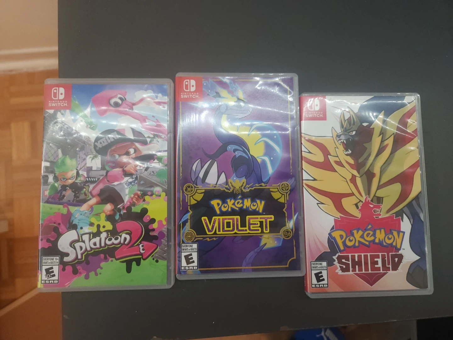 Blue Nintendo Switch Lite console. Includes original box, charger, and a protective case. Also includes Splatoon 2, Pokémon Violet, and Pokémon Shield games.