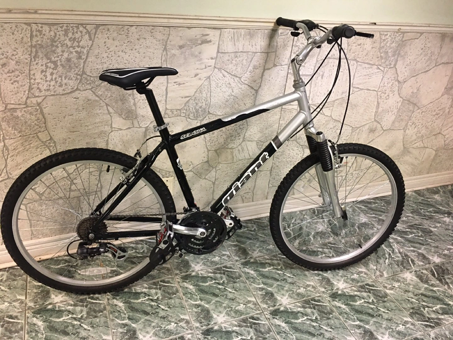Giant Sedona mountain bike front shock, 26 inch wheel, 19 inch frame size, 21 speed, new inner gear/brake cables, chain , seat/seat pole/seat clamp, hand grips and new pedals/foot straps and shoe clips.