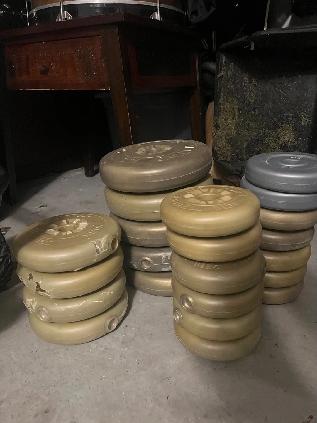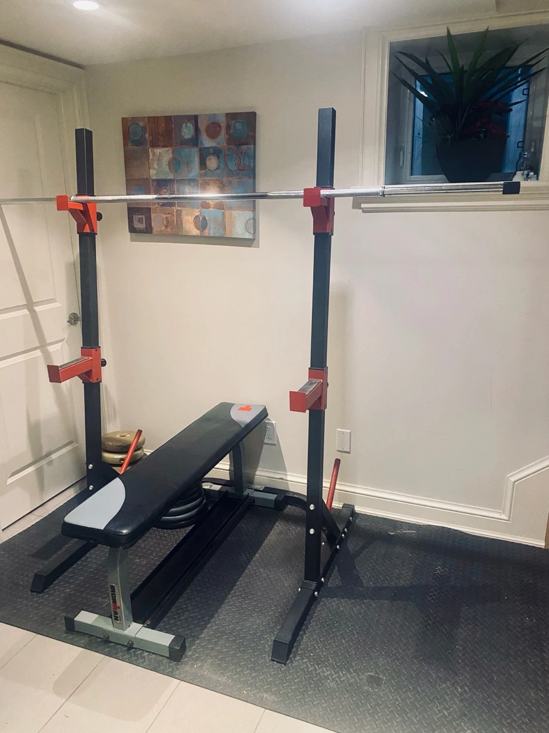 This is the AmStaff TR057D Squat/Press Rack. It's a sturdy rack for your home gym. Includes the 35lb bar, eight 25lb and two 10lb plates, as well as assorted smaller plates seen in last photo. Does not include bench. Sold as a package.