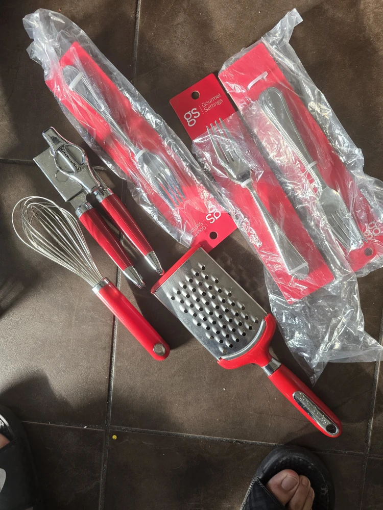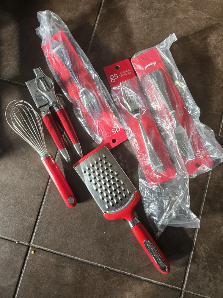 Selling a brand new Gourmet Settings kitchen utensil set! This set includes a whisk, grater, can opener, and forks, all in a vibrant red colour. Perfect for adding a pop of colour to your kitchen!