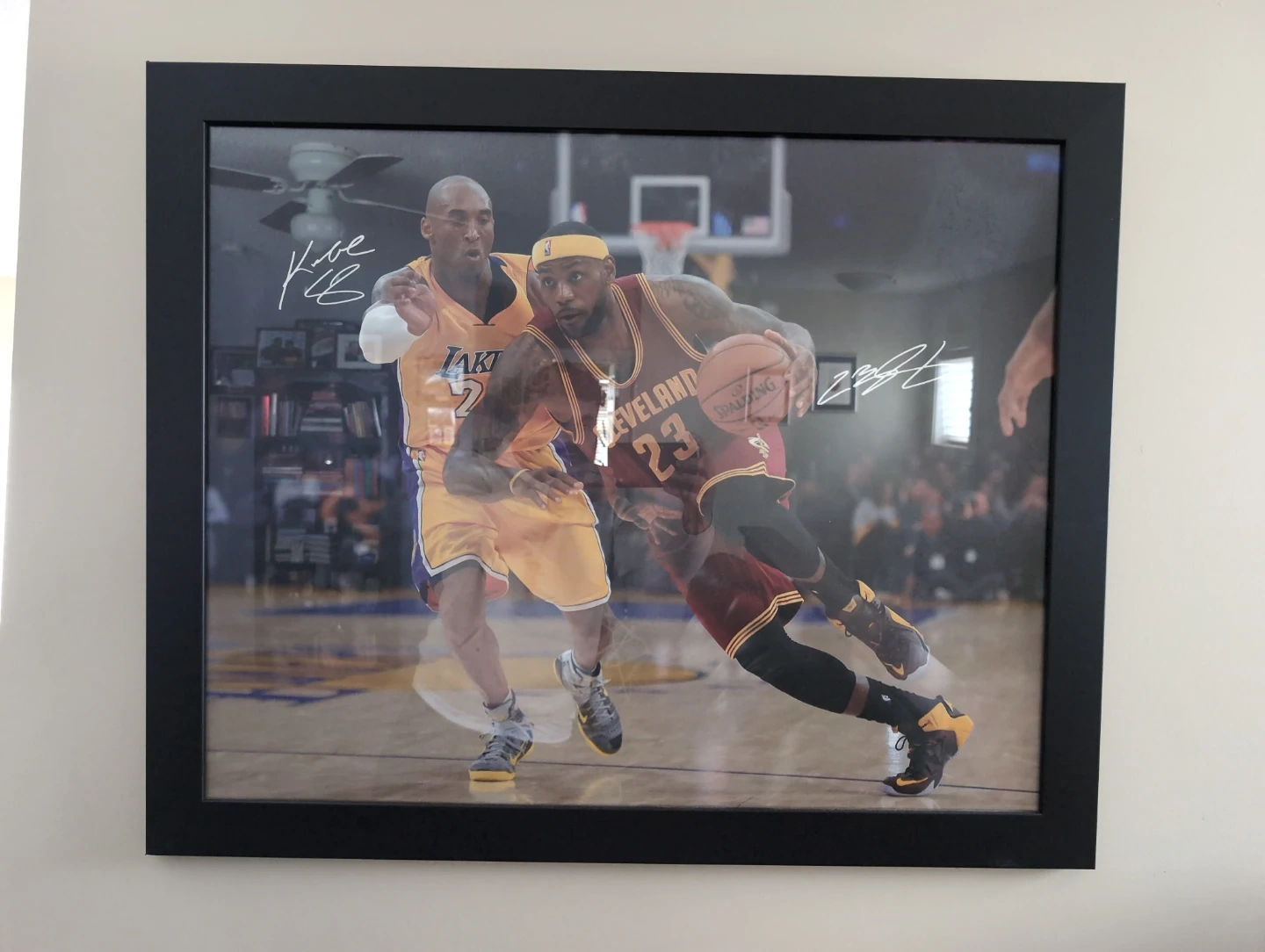 I have a framed photo of Kobe Bryant and Lebron James. Both signatures are simulated and on the photo itself. The frame is black. 85'x70'