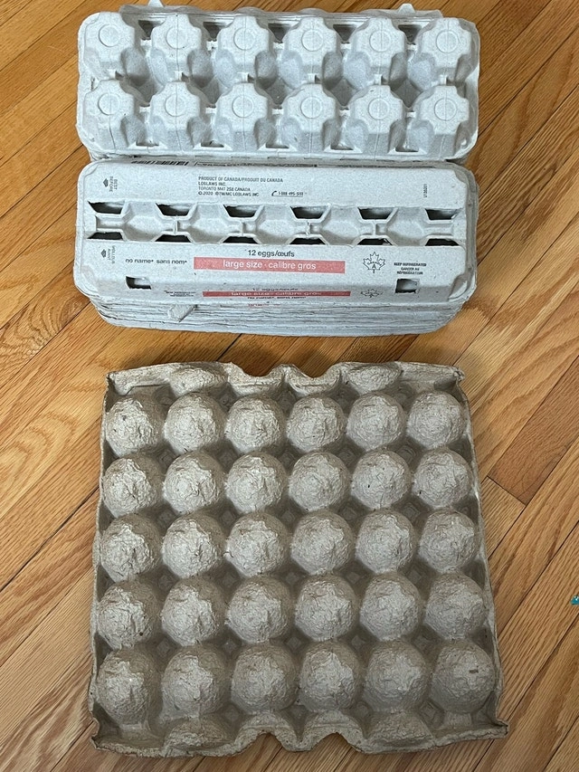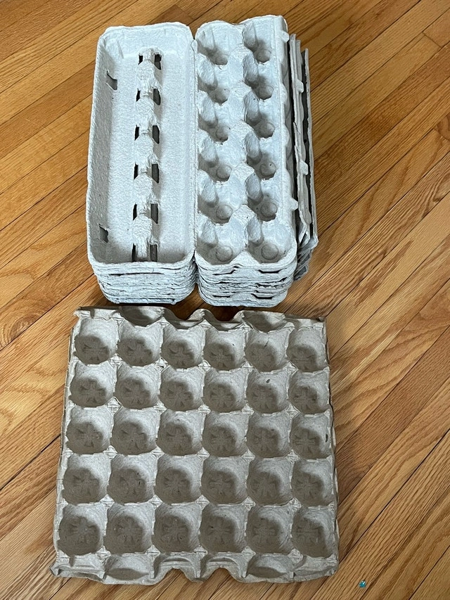 15 twelve-egg, large size cartons with lids and 1 thirty-count egg tray. Take everything for $2.
