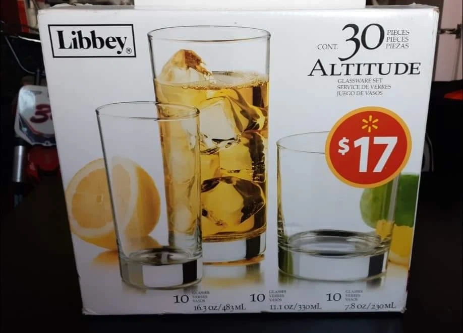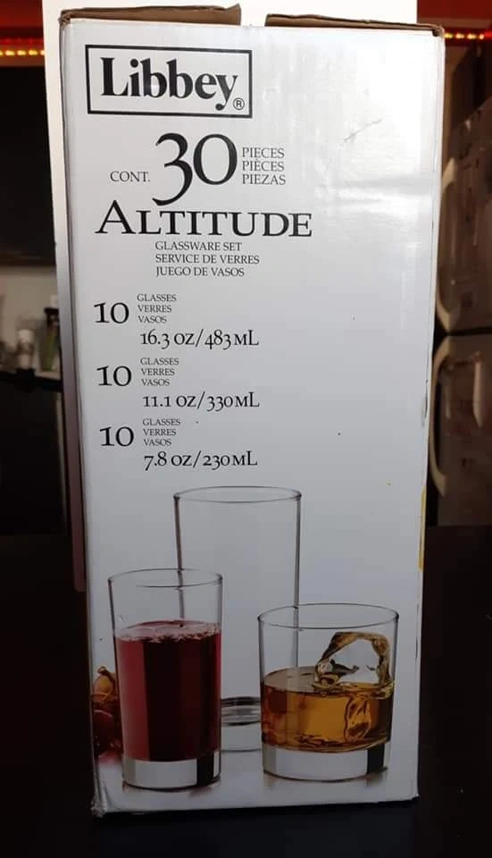 Includes: (10) 16.3 oz. Tall Cooler Glasses, (10) 11.1 oz. Double Old Fashioned Glasses and (10) 7.8 oz. Juice Glasses.