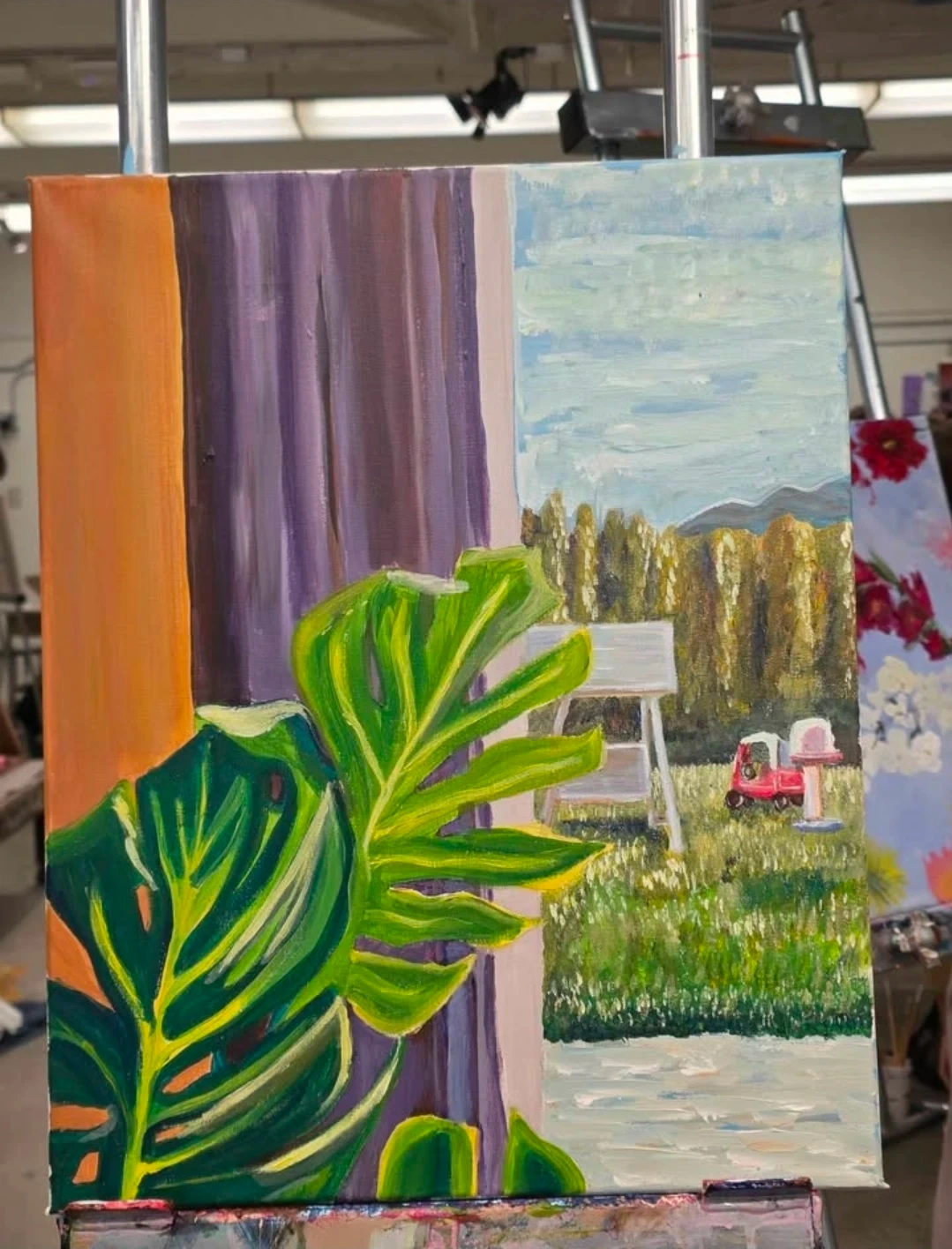 LANDSCAPE ACRYLIC PAINTING ON CANVAS PATIO WINDOW VIEW